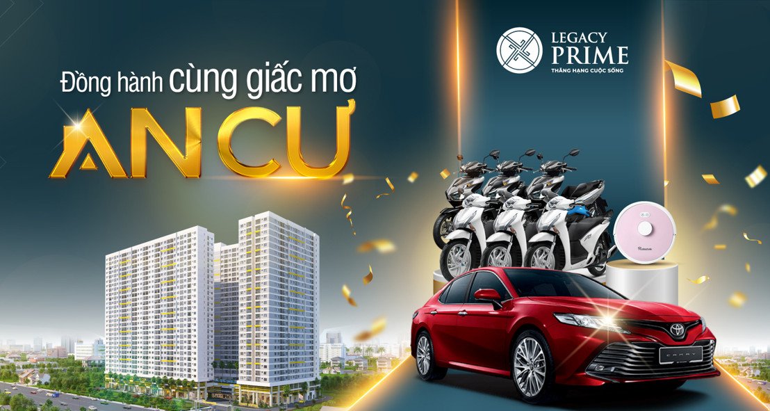 2CĂN HỘ LEGACY PRIME NGAY AEON MALL BÌNH DƯƠNG VÀ KCN VSIP 1: + Trả trước chỉ 100tr/căn ký ngay Hợp đồng mua bán. + Pháp lý hoàn thiện, sổ hồng riêng. + Trả góp 6tr/tháng, chiết khấu lên đến 18%. + Ngân hàng hỗ trợ 75%. – Miễn lãi đến khi nhận nhà. – Miễn trả gốc 36 tháng, lãi suất 9.9%/năm trong 36 tháng. ———————————————— THÔNG TIN DỰ ÁN LEGACY PRIME: + Nhà thầu xây dựng: Tập đoàn Hòa Bình, Quản lý vận hành: SAVISTA + Quy mô: hơn 1 ha, 2 tháp cao 29 tầng nổi và 1 tầng hầm. + Thiết kế căn hộ: Studio – 1PN – 2PN + Diện tích căn hộ: 33m2, 42m2, 45m2, 55m2, 60m2 + Sở hữu hơn 30 tiện ích hiện đại: Hồ bơi, Nhà trẻ, Shophouse, Công viên, Hệ thống giáo dục Mầm non tới THPT, Chợ, Bệnh viện, Siêu thị,… + Bàn giao nhà: Nhà hoàn thiện cơ bản, nội thất cao cấp hàng đầu. + Số lượng thang máy: 18 thang máy cho 1 mặt bằng căn hộ. + Tiến độ: dự kiến bàn giao nhà quý 3/2023. ———————————————— CƠ HỘI MUA NHÀ TRÚNG NHÀ + XE Ô TÔ CAMRY 2.0G + Tặng bộ nội thất cao cấp hàng đầu + Khóa cửa thông minh 4 tích hợp. + Tham quan nhà mẫu trúng ngay nhà thật. + Ưu đãi cho 100 khách hàng đầu tiên đến 4 chỉ vàng SJC.