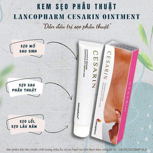 Kem trị sẹo Cesarin hay Cesarin Ointment Lacopharm là dòng sản phẩm được nghiên cứu và phát triển bởi Lancopharm. Sản phẩm được bào chế chuyên biệt dành cho những người bị sẹo sau phẫu thuật, ngăn ngừa quá trình phát triển và hình thành sẹo, thúc đẩy quá trình tái tạo da mới, làm dịu da, hạn chế tình trạng ngứa và đau, hình thành sẹo thâm, làm mờ sẹo, ngăn ngừa tình trạng tăng sắc tố da, giảm thiểu rạn da và sẹo.