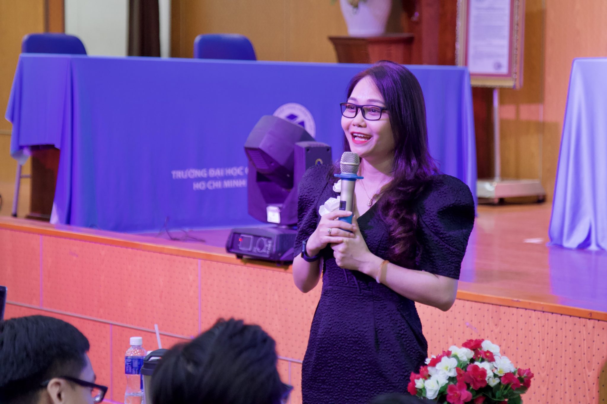 Bà Trần Thị Minh Khương – Tổng giám đốc CK HR Consulting chia sẻ tại ngày hội. Bà đánh giá cao sự hỗ trợ của Ban tổ chức HUFI đã đồng hành và tạo mọi điều kiện thuận lợi cho CK HR Consulting kết nối doanh nghiệp tuyển dụng trong nhiều năm qua.