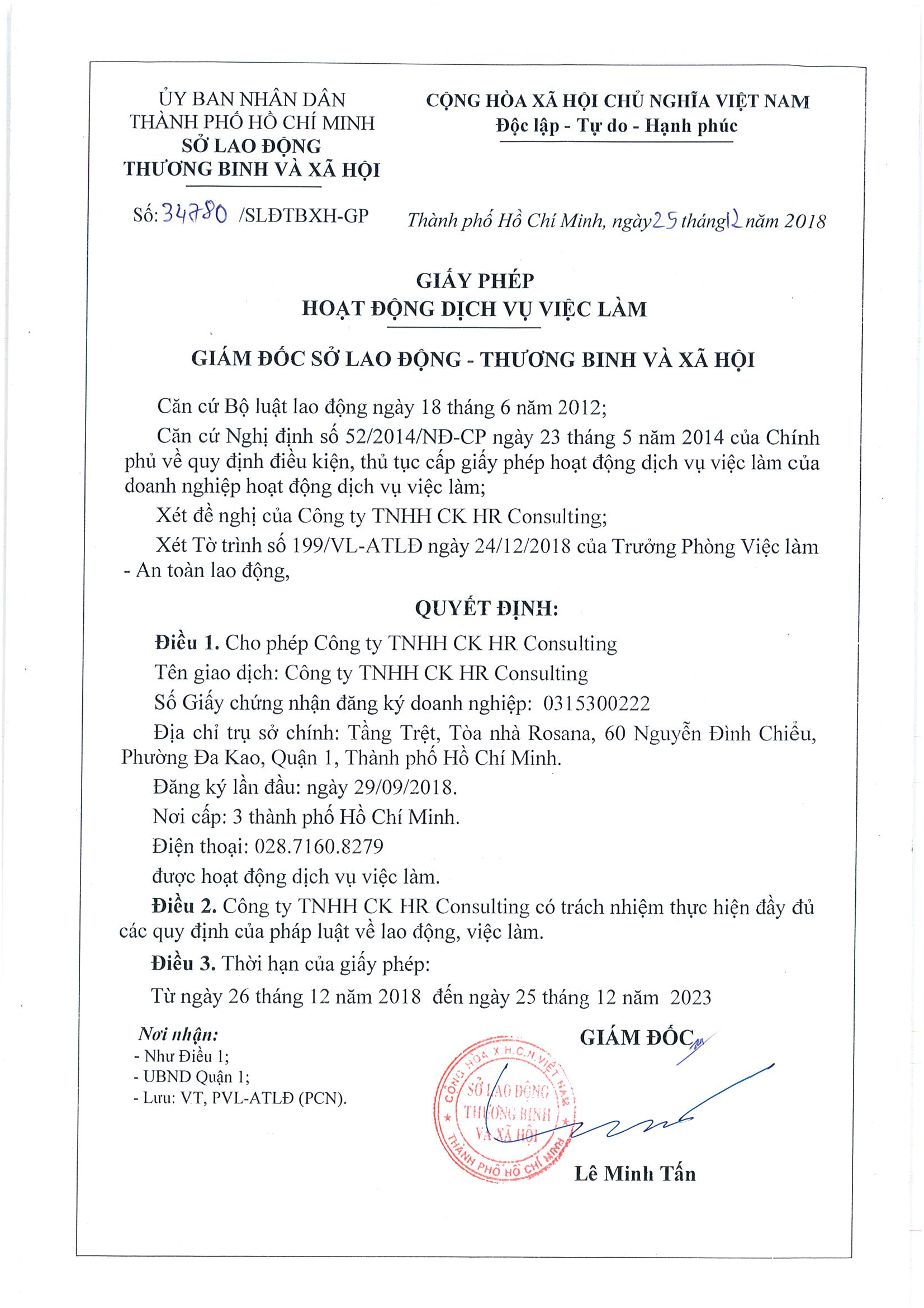 CK HR Consulting trân trọng thông báo đến Quý khách hàng Giấy phép hoạt động dịch vụ việc làm: