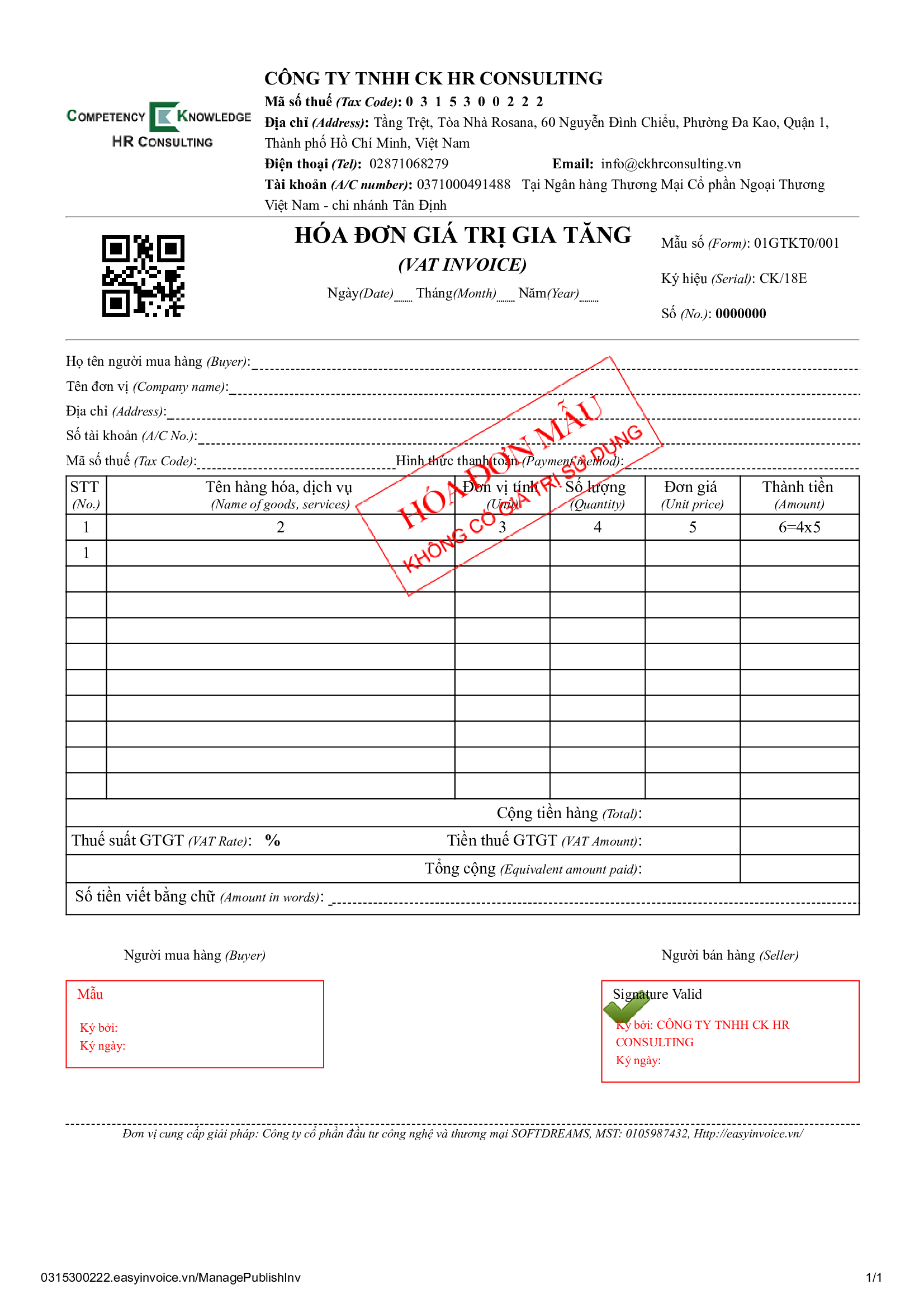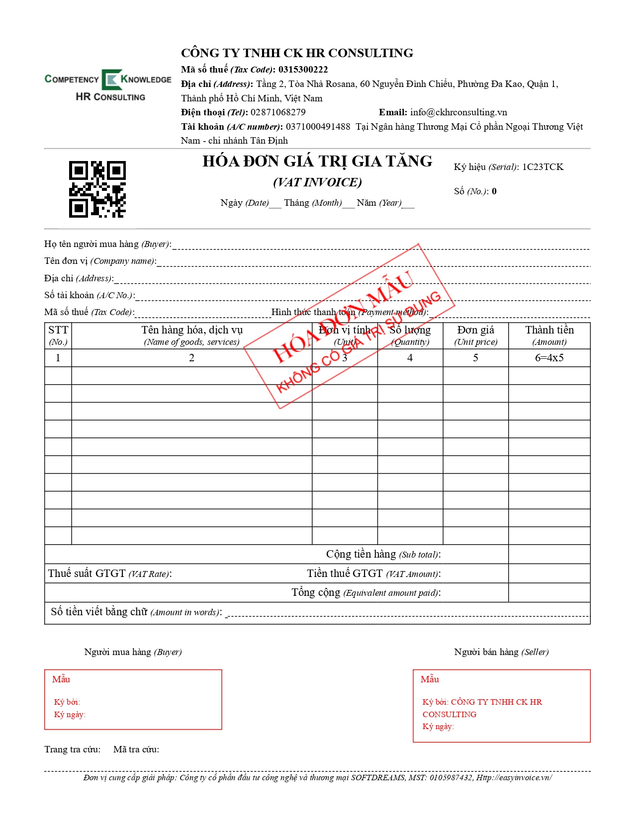 CK HR Consulting trân trọng thông báo mẫu hoá đơn Giá trị gia tăng. Áp dụng trước ngày 15/8/2023.