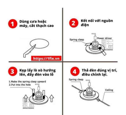 Đưa đèn lên bóp phần tai đèn 90 độ về đế đèn, đưa sâu vào lỗ khoét rồi thả tay ra.