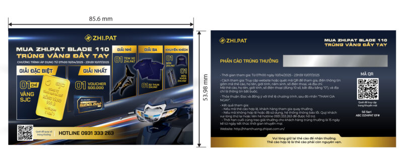 – Trong thời gian khuyến mại, khi mua bất kỳ Sản phẩm ZHI.PAT BLADE 110, khách hàng sẽ có cơ hội nhận được 01 (một) thẻ cào đặt bên trong Hộp chứa sản phẩm. Tổng số thẻ cào được phát hành là: 2,000 thẻ cào sẽ được đưa ngẫu nhiên vào tổng số 2,000 sản phẩm khuyến mại.