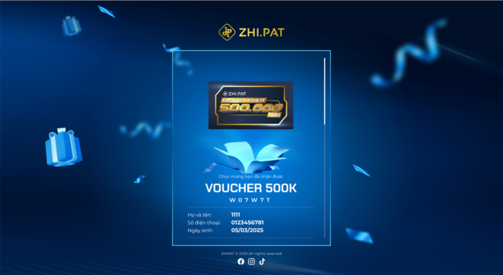Hệ thống hiển thị hình ảnh GIFT VOUCHER 500,000 VND kèm dòng chữ “Chúc mừng bạn đã nhận được VOUCHER 500K” kèm mã thẻ cào và thông tin cá nhân đã cung cấp bên dưới.