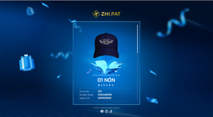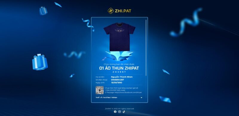 Hệ thống hiển thị hình ảnh áo thun kèm dòng chữ “Chúc mừng bạn đã nhận được 01 ÁO THUN ZHIPAT” kèm mã thẻ cào và thông tin cá nhân đã cung cấp bên dưới.