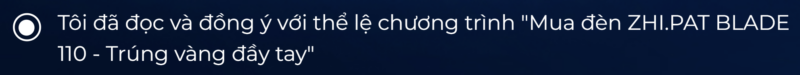 Bước 6. Khách hàng đồng ý với Thể lệ chương trình thì nhấn chọn vào ô “Tôi đã đọc và đồng ý với thể lệ chương trình “Mua đèn ZHI.PAT BLADE 110 – Trúng vàng đầy tay”.