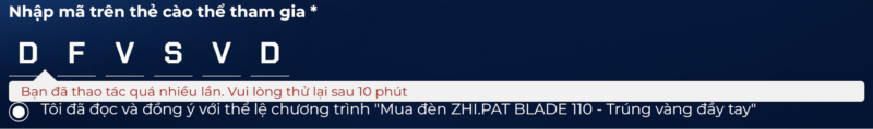 Trường hợp nhập sai mã thẻ cào lần thứ 06 liên tiếp, số điện thoại tham gia của khách hàng sẽ bị tạm khóa 10 phút tính từ lần nhập sai thứ 06 và website sẽ hiển thị thông báo trên màn hình: “Bạn đã thao tác quá nhiều lần. Vui lòng thử lại sau 10 phút”. Liên hệ Hotline 0931.333.263 (cước viễn thông theo quy định) để được hỗ trợ”