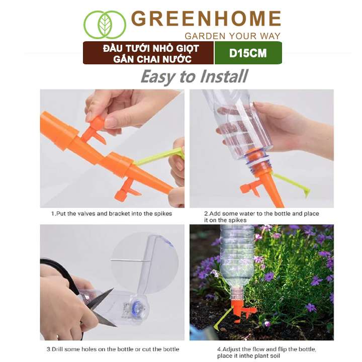 Đầu tưới nhỏ giọt gắn chai nước dơn giản và tiện lợi, không cần cài đặt rườm rà, chỉ cần khoan một số lỗ ở đáy chai hoặc cắt phần đuôi chai