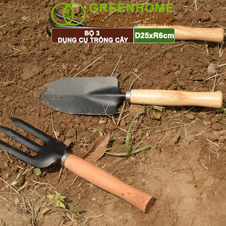 Dụng Cụ Làm Vườn D25cm, Cán Gỗ, Lưỡi Thép, Gồm Xẻng Xúc Đất, Cào, Chĩa, Trồng Cây, Làm Cỏ Dễ Dàng