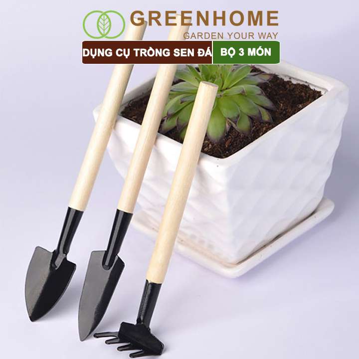 Dụng cụ làm vườn mini, 3 món, tiện lợi, chuyên dụng trồng Sen đá, cán gỗ |Greenhome