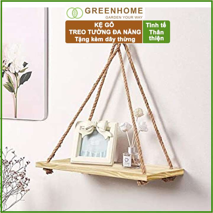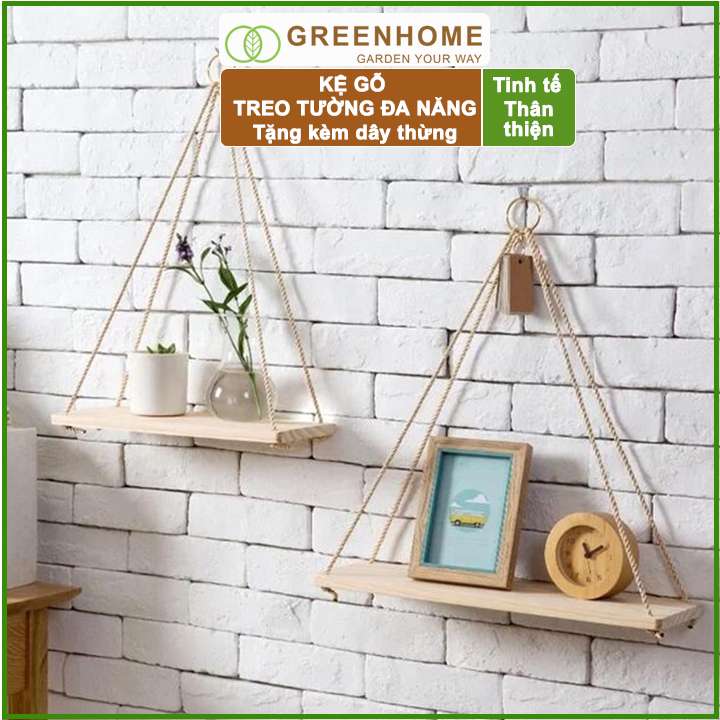 Kệ gỗ treo tường, D40xR12cm, gỗ thông, tặng kèm 2m dây thừng |Greenhome