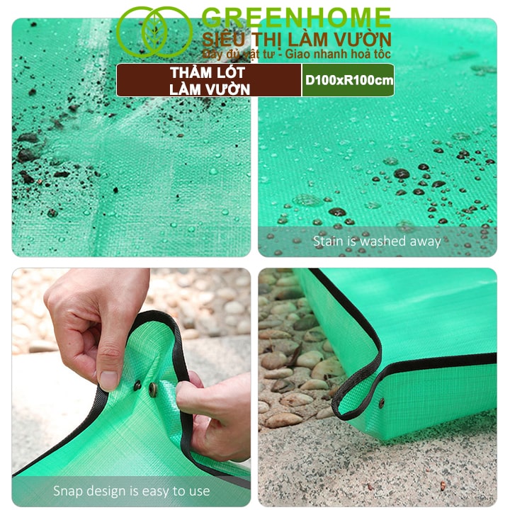 Thảm Lót Làm Vườn với bốn góc có nút để ngăn nước và đất rò rỉ ra ngoài. Mỗi bốn góc có hai khóa đồng. Khi sử dụng, nước và đất không dễ tràn ra ngoài và tránh làm bẩn sàn nhà, bắt bụi bẩn tuyệt vời