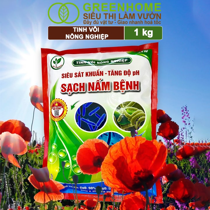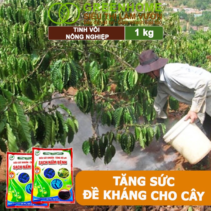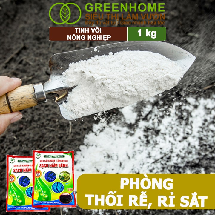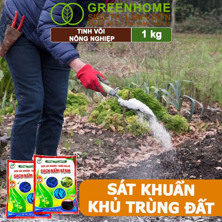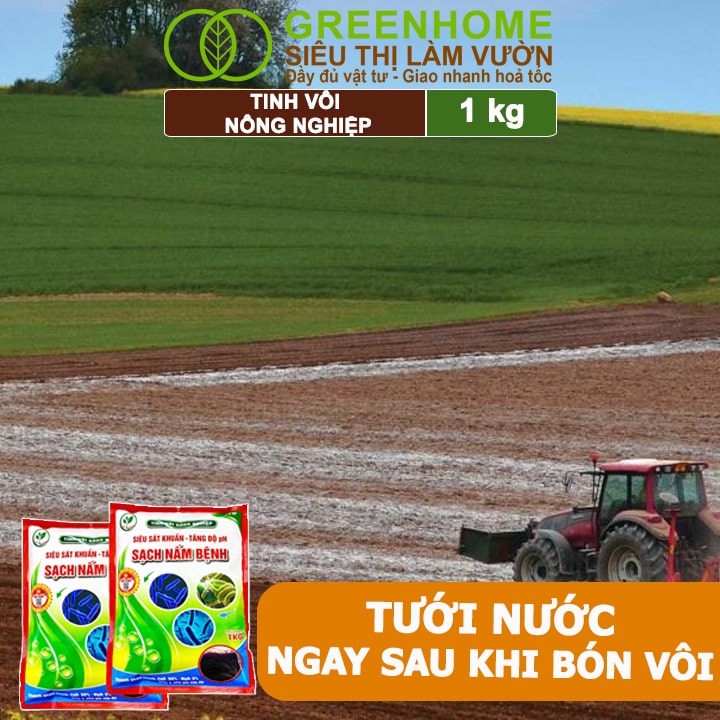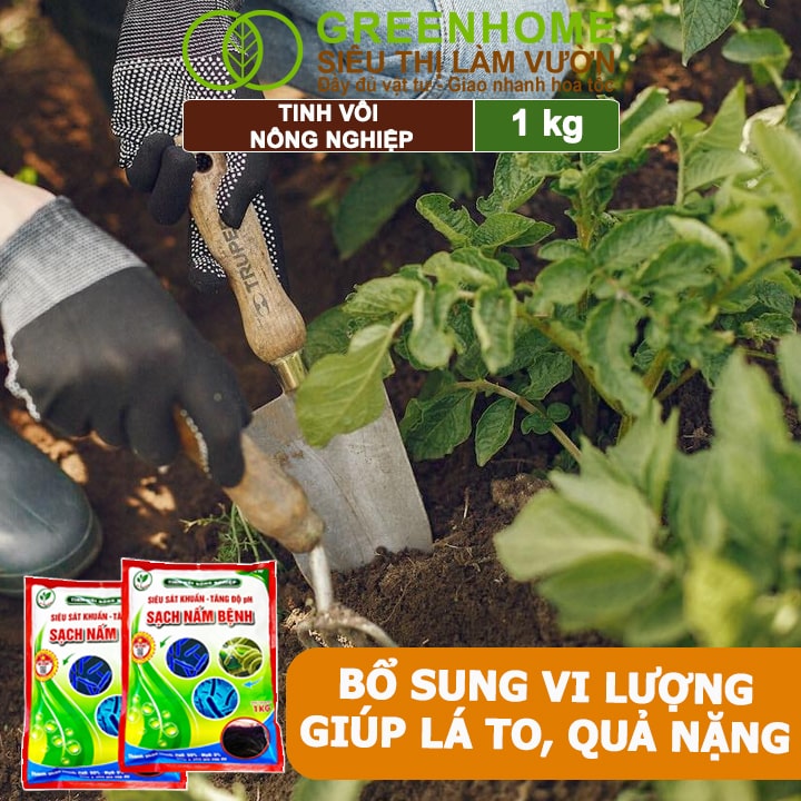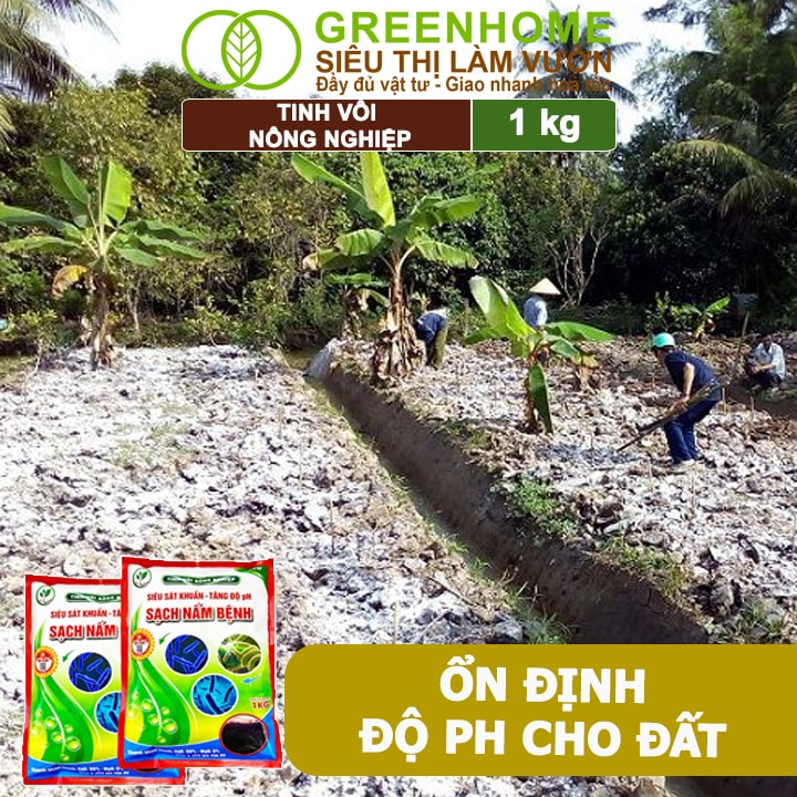 Tinh vôi nông nghiệp Greenhome, Bao 1kg, cải tạo đất, tăng độ PH, sạch nấm bệnh, sát trùng ao, chuồng trại, bổ sung vi lượng giúp lá to, quả nặng
