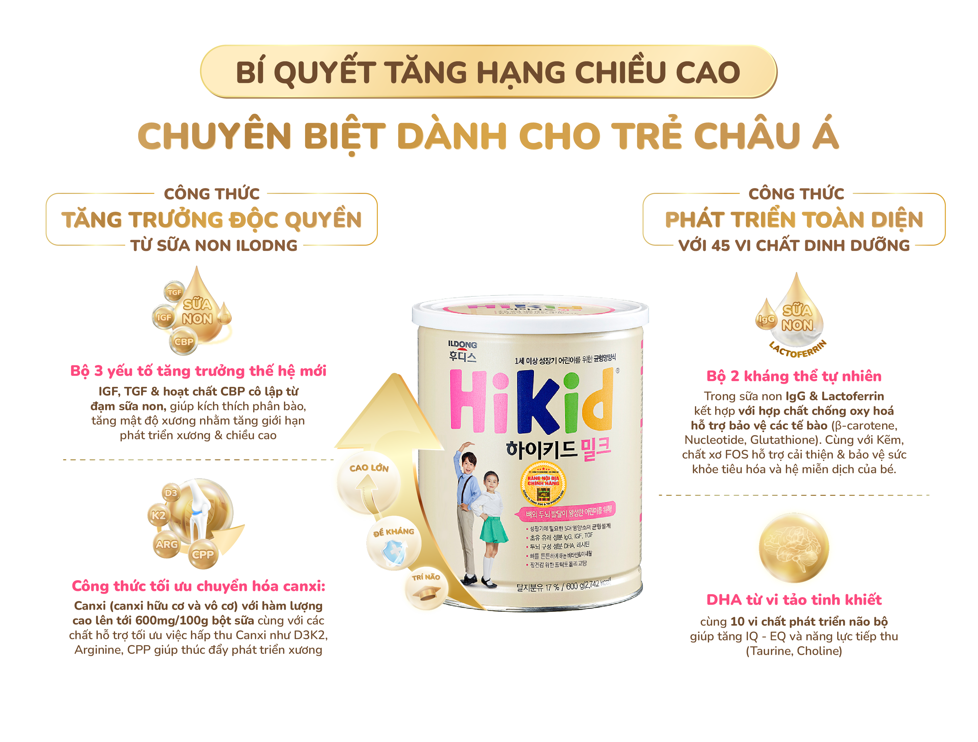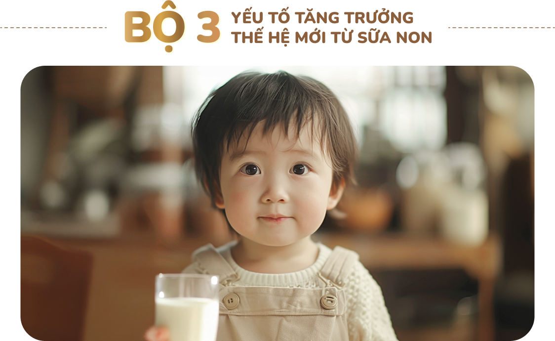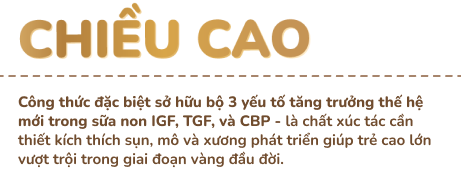 - Công thức đặc biệt sở hữu bộ 3 yếu tố tăng trưởng thế hệ mới trong sữa non IGF, TGF, và CBP – là chất xúc tác cần thiết kích thích miếng, mô và xương phát triển giúp trẻ cao lớn vượt trội trong giai đoạn vàng đầu đời.