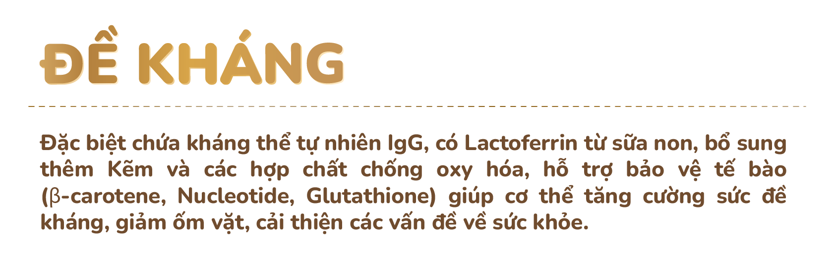 - Tăng cường đề kháng: Đặc biệt chứa kháng thể tự nhiên IgG, có Lactoferrin từ sữa non, bổ sung thêm Kẽm và các hợp chất chống oxy hóa, hỗ trợ bảo vệ tế bào (β-carotene, Nucleotide, Glutathione) giúp cơ thể tăng cường sức đề kháng, giảm ốm vặt, cải thiện các vấn đề về sức khỏe.