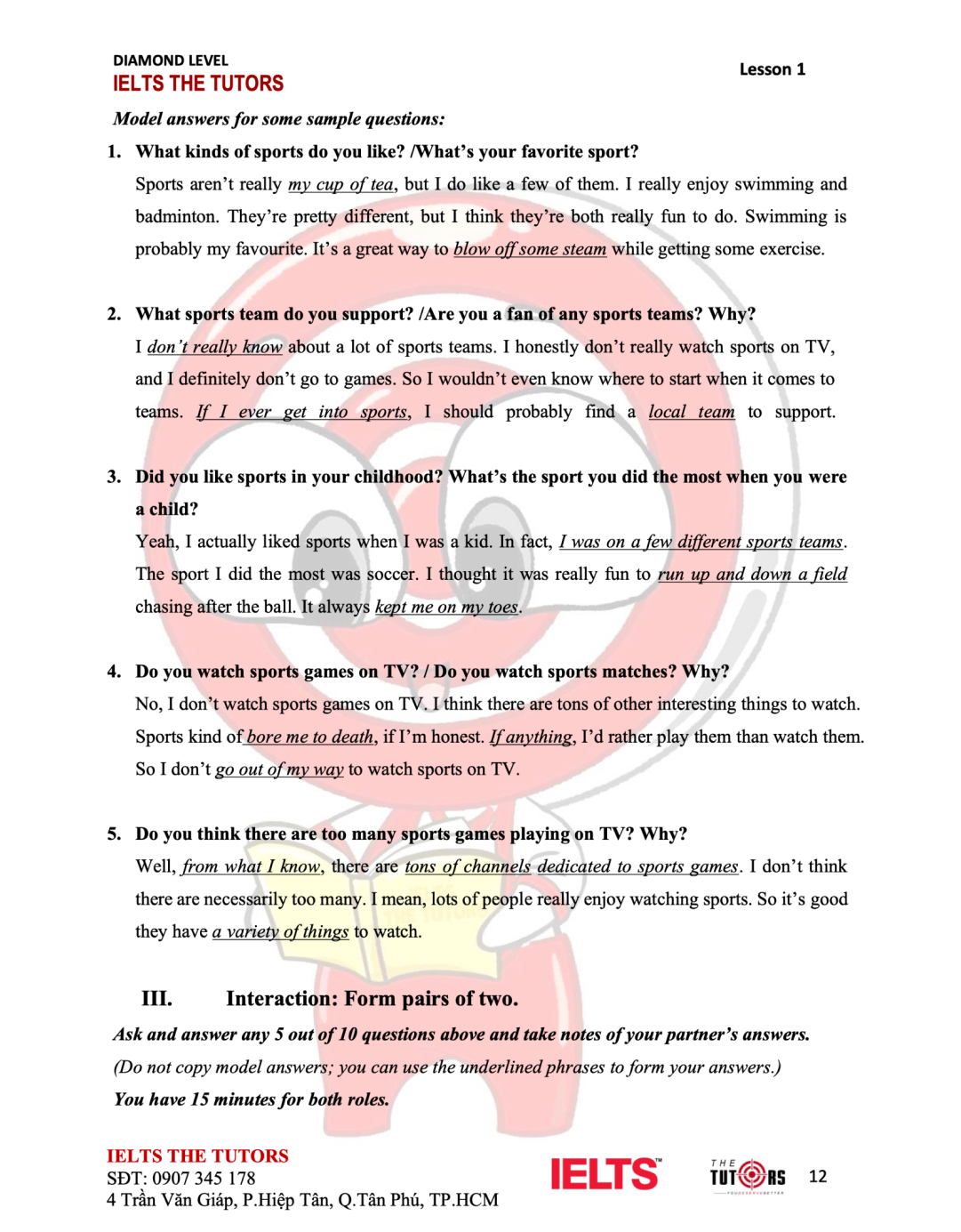 Speaking: Rèn luyện phản xạ với các câu hỏi Part 1 và Part 2. Giáo trình giúp học viên mở rộng câu trả lời và sử dụng từ nối linh hoạt.