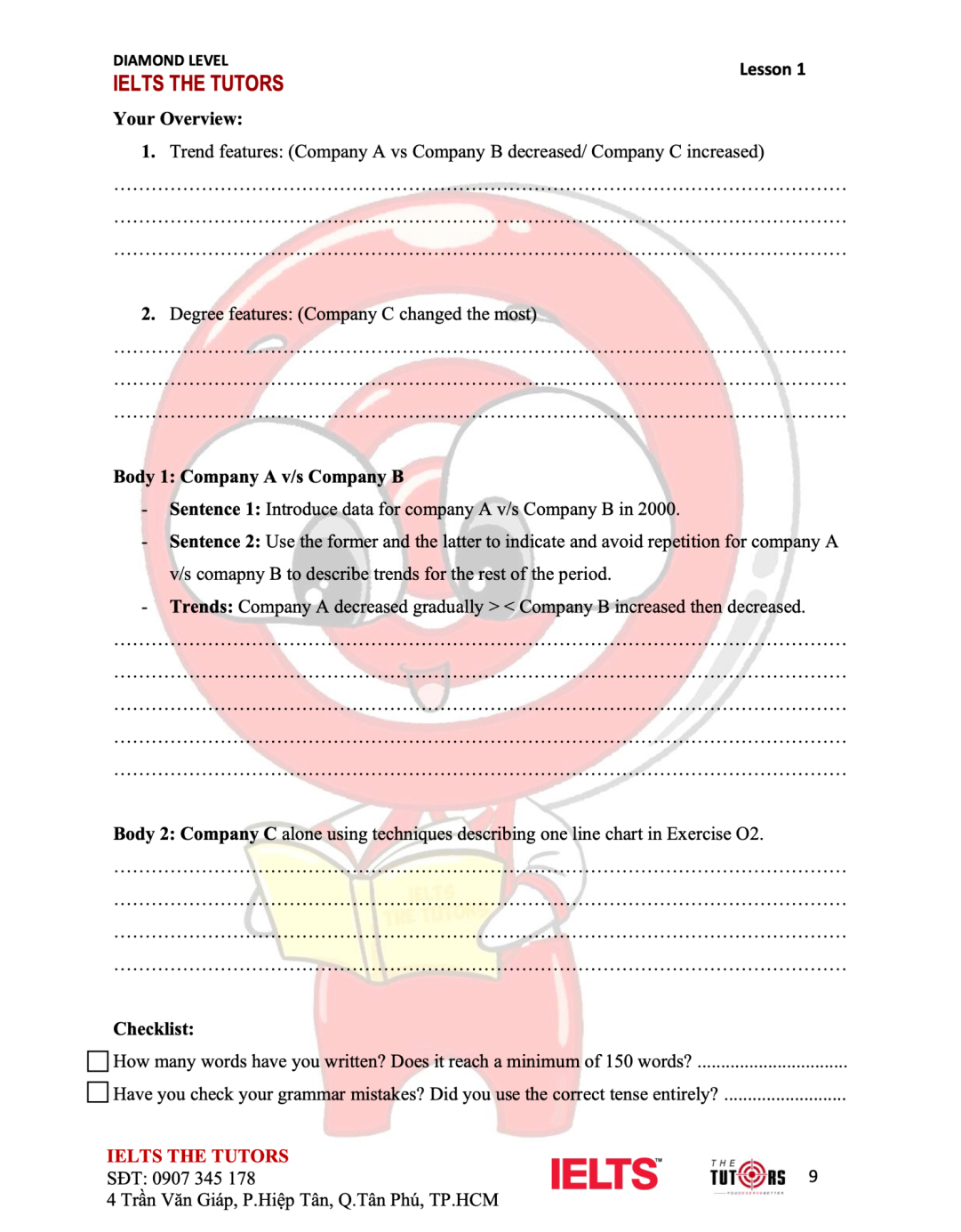 Writing: Hướng dẫn viết Task 1 (biểu đồ cơ bản) và Task 2 (bài luận Opinion và Problem-Solution). Tập trung phát triển ý tưởng và cách tổ chức bài viết mạch lạc.