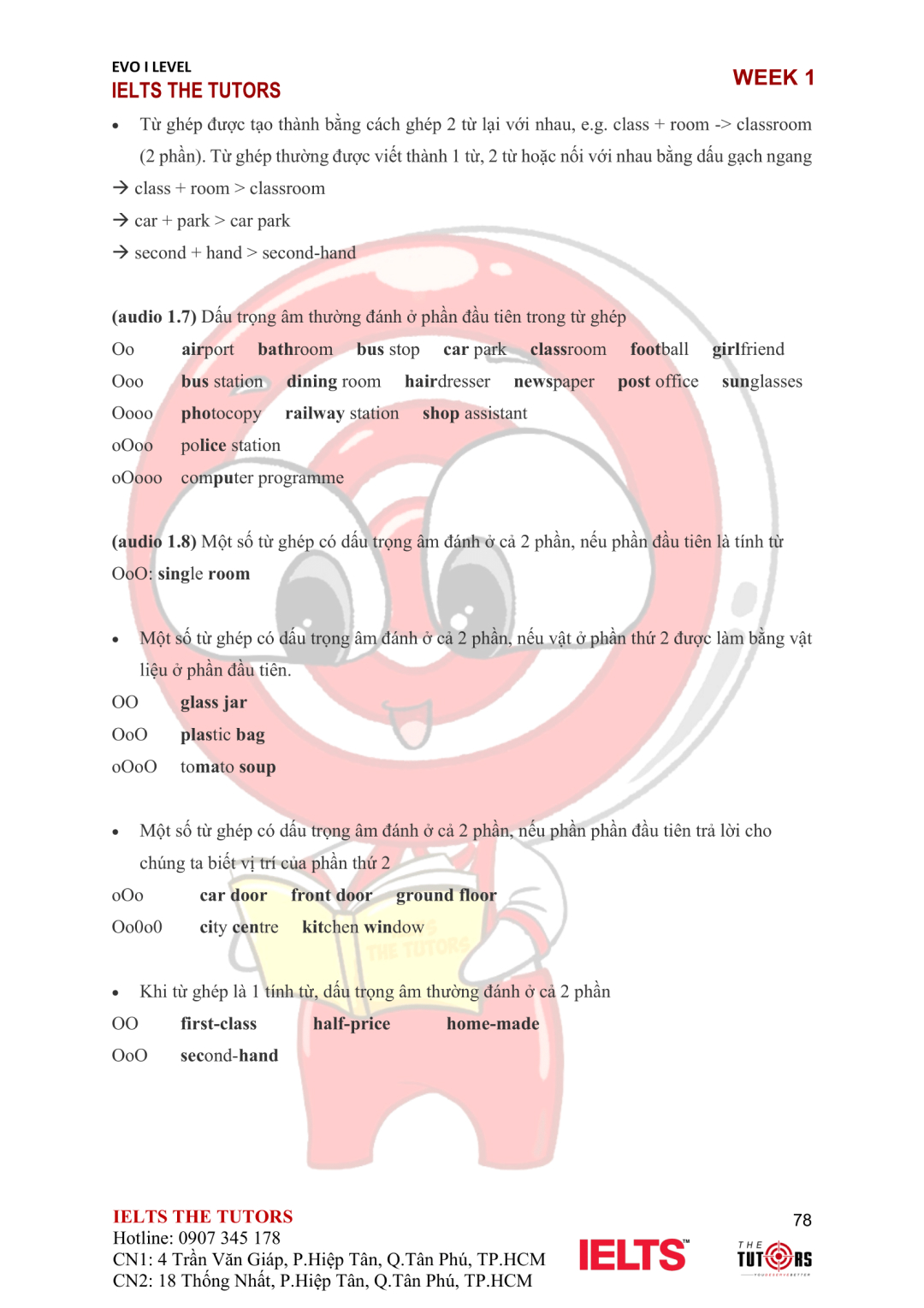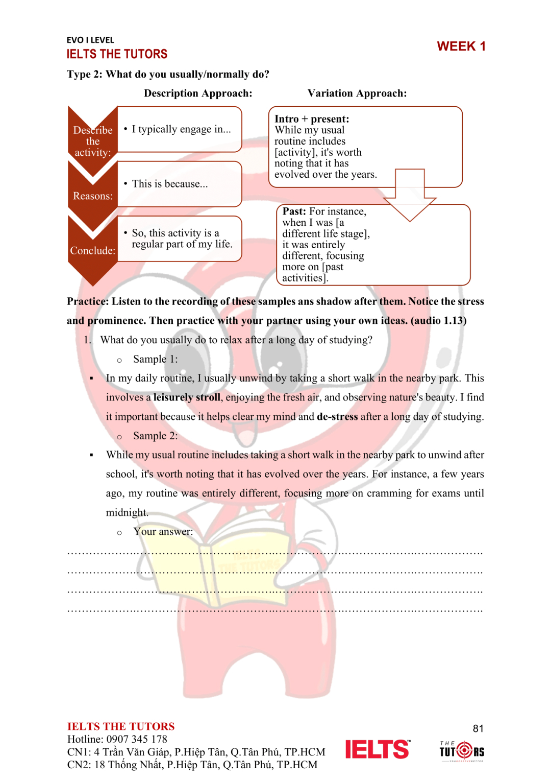 Vocab/Grammar: Tích hợp từ vựng và cấu trúc câu phức phù hợp với trình độ B2 trở lên. Các chủ đề nâng cao như Crime, Culture, và Urbanization được khai thác sâu, giúp học viên cải thiện khả năng paraphrasing và phát triển câu phức tạp.