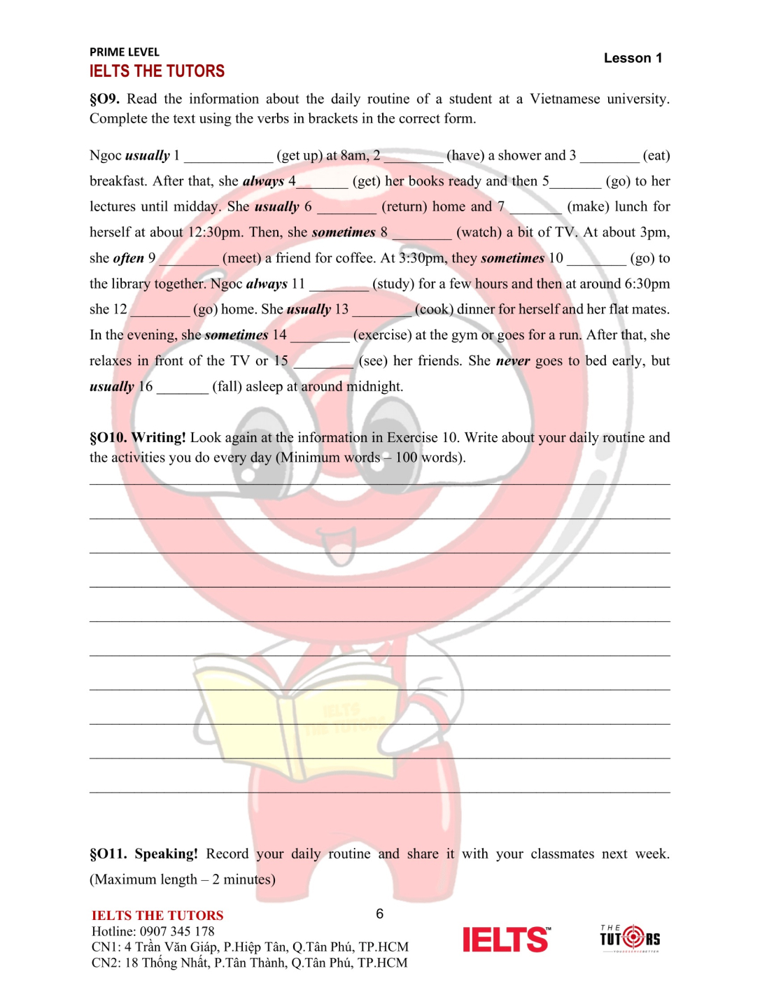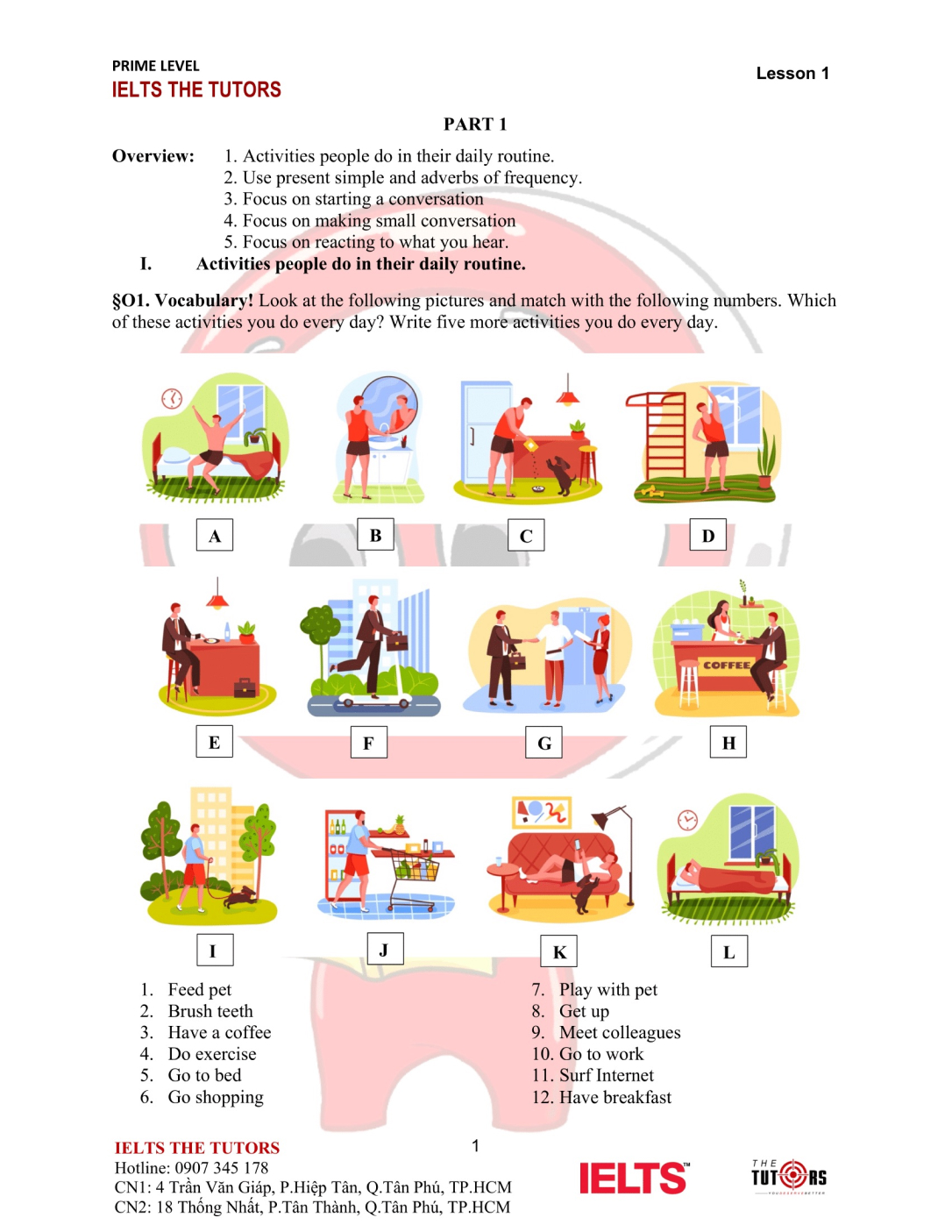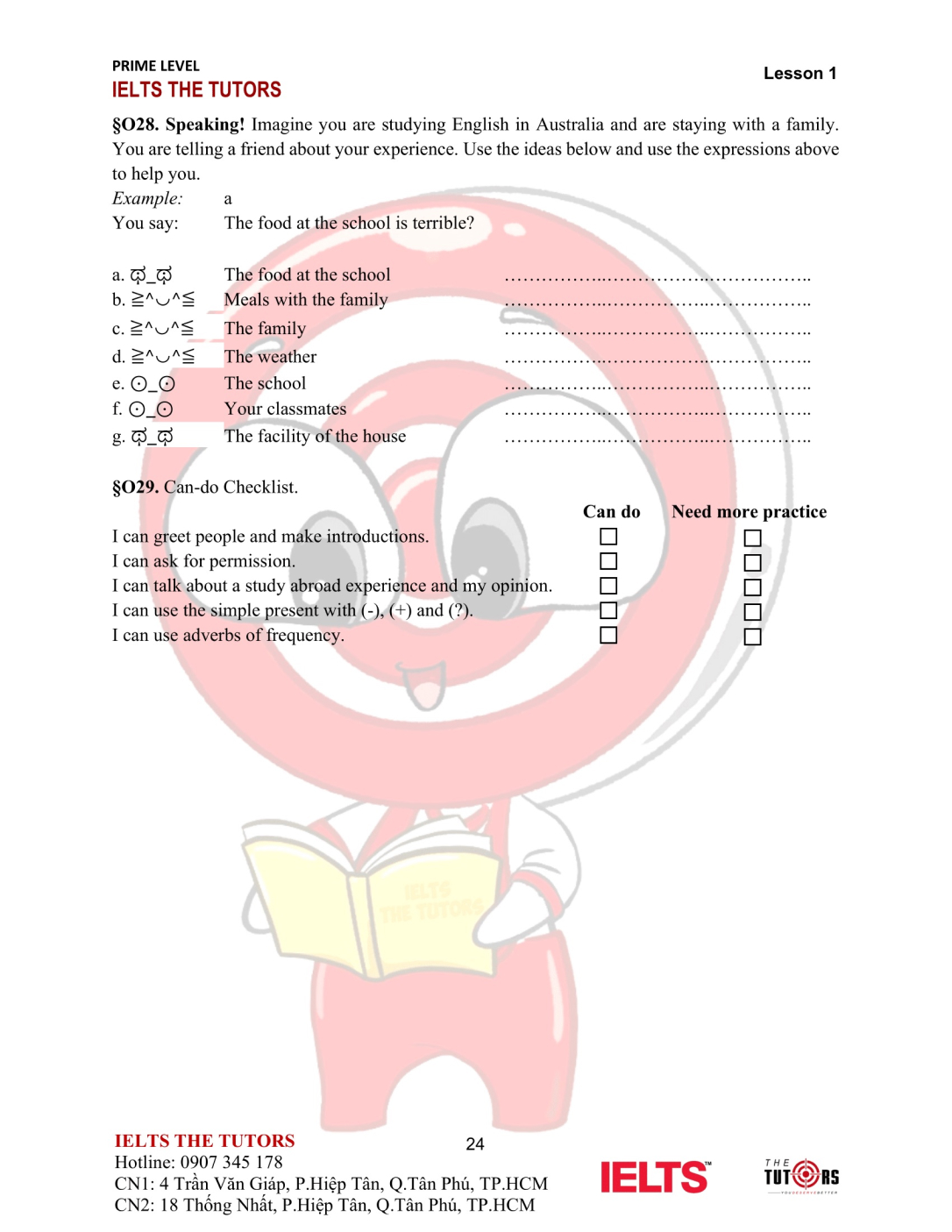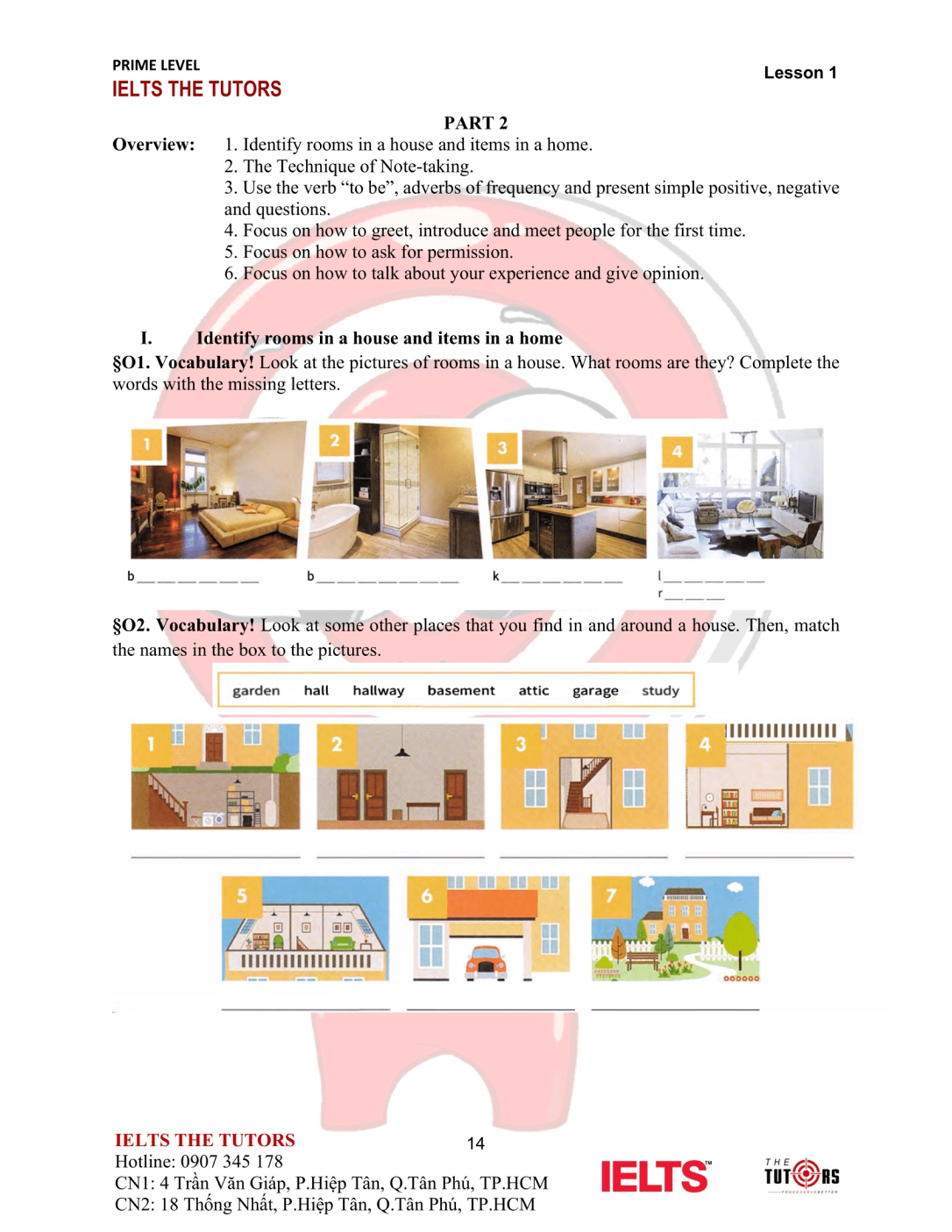 Vocab/Grammar: Học và thực hành sử dụng nhuần nhuyễn từ vựng A1-A2 của 8 chủ đề phổ biến nhất trong IELTS (Family, Friends, Sports, Holidays, Health, Hobbies, Transports…). Áp dụng được các cấu trúc cơ bản, thì hiện tại và quá khứ, động từ khiếm khuyết vào câu nói