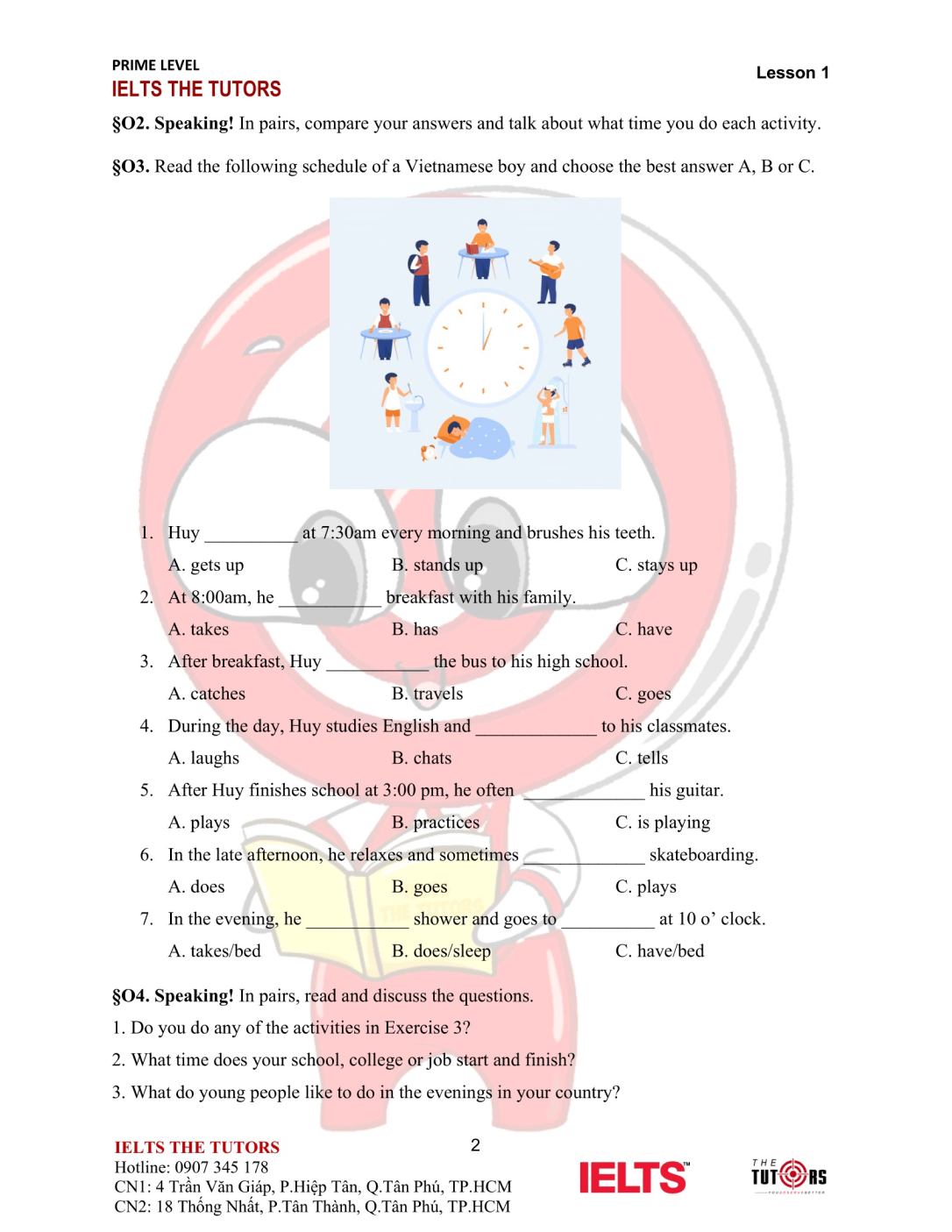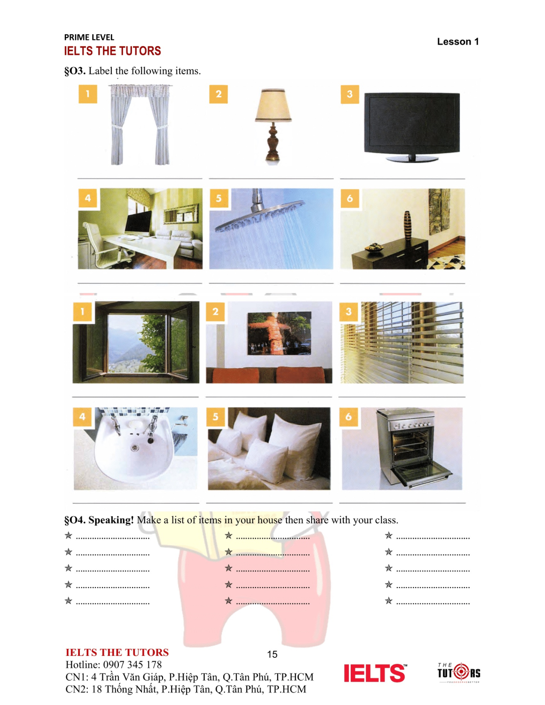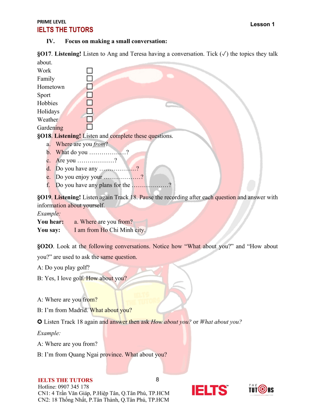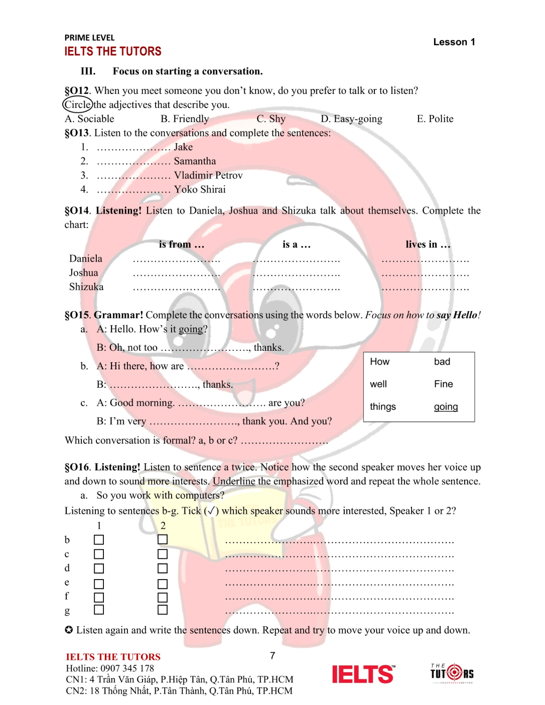 Vocab/Grammar: Học và thực hành sử dụng nhuần nhuyễn từ vựng A1-A2 của 8 chủ đề phổ biến nhất trong IELTS (Family, Friends, Sports, Holidays, Health, Hobbies, Transports…). Áp dụng được các cấu trúc cơ bản, thì hiện tại và quá khứ, động từ khiếm khuyết vào câu nói