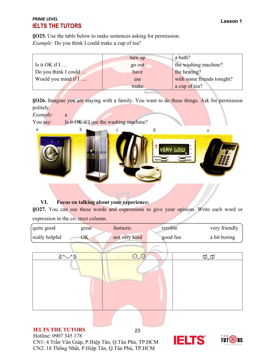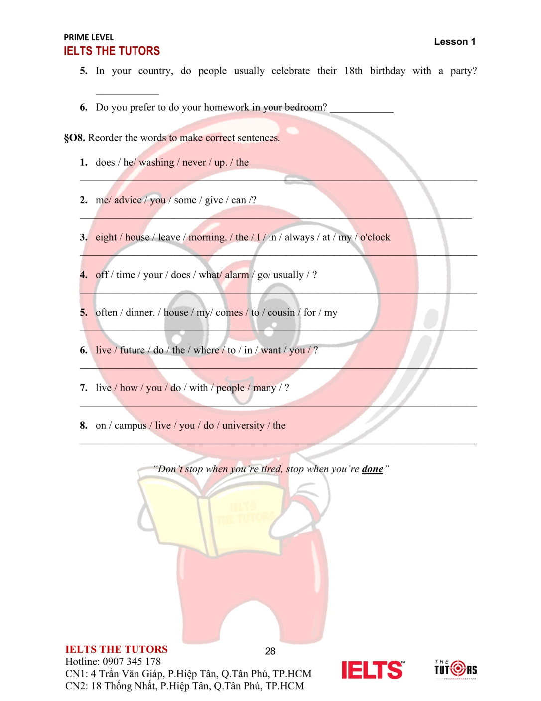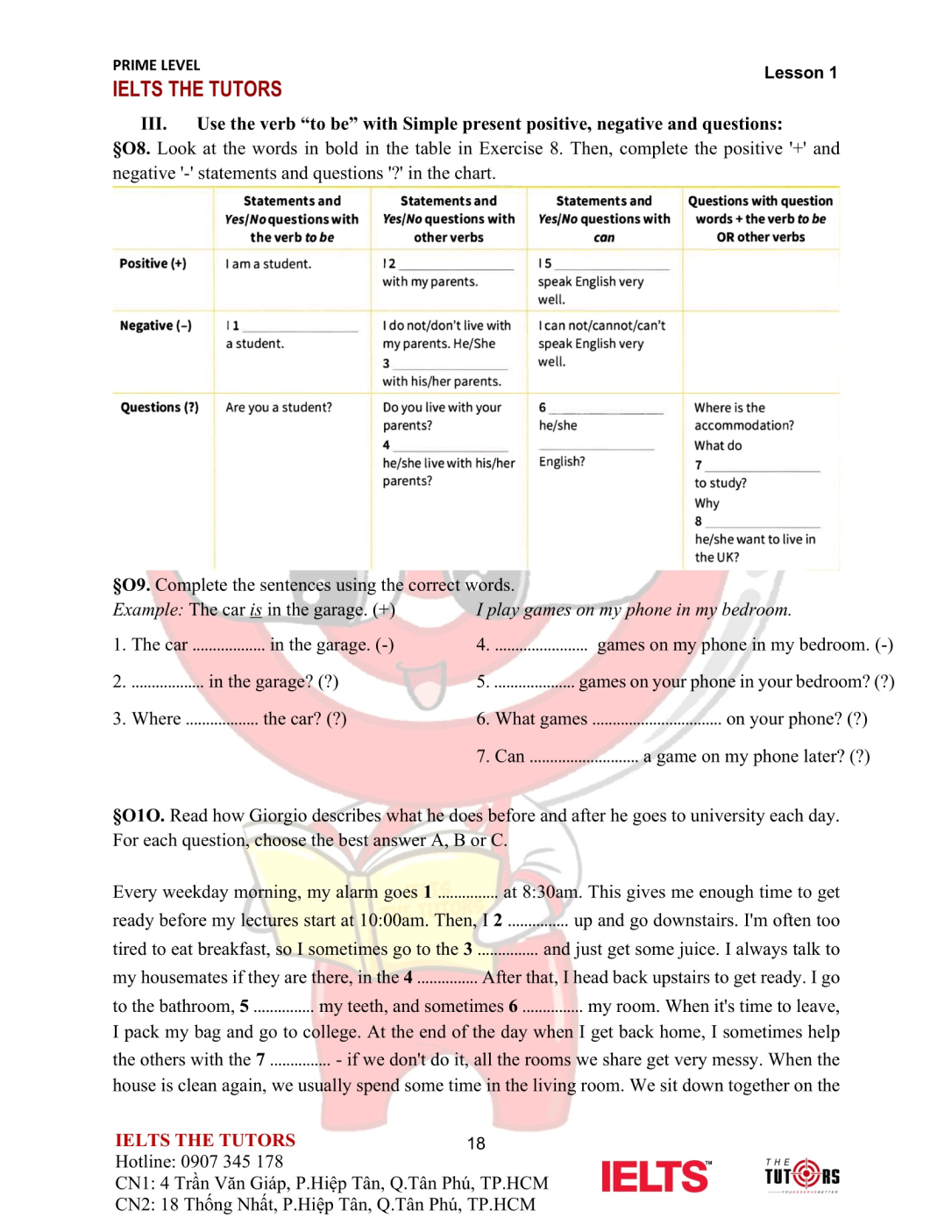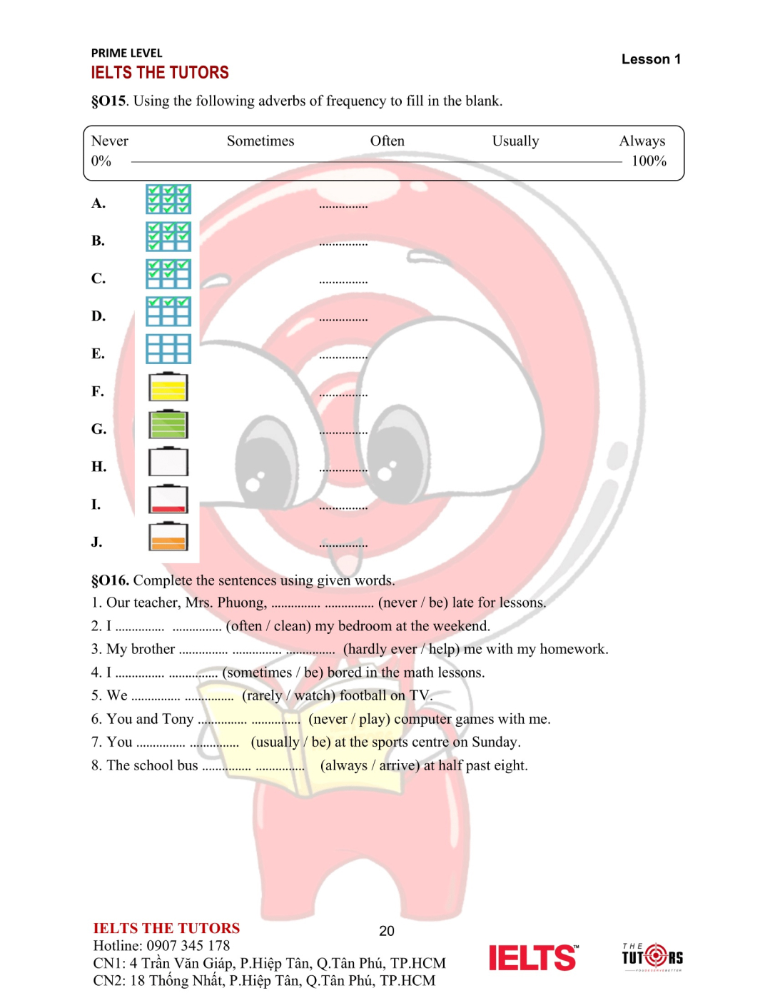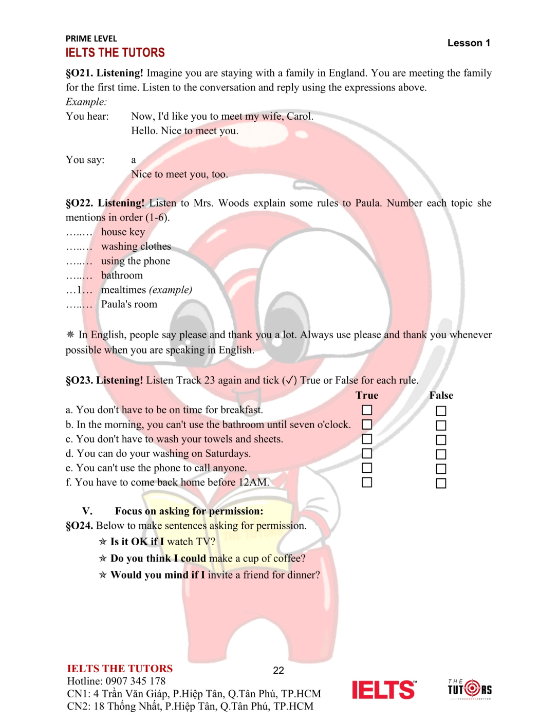 Vocab/Grammar: Học và thực hành sử dụng nhuần nhuyễn từ vựng A1-A2 của 8 chủ đề phổ biến nhất trong IELTS (Family, Friends, Sports, Holidays, Health, Hobbies, Transports…). Áp dụng được các cấu trúc cơ bản, thì hiện tại và quá khứ, động từ khiếm khuyết vào câu nói