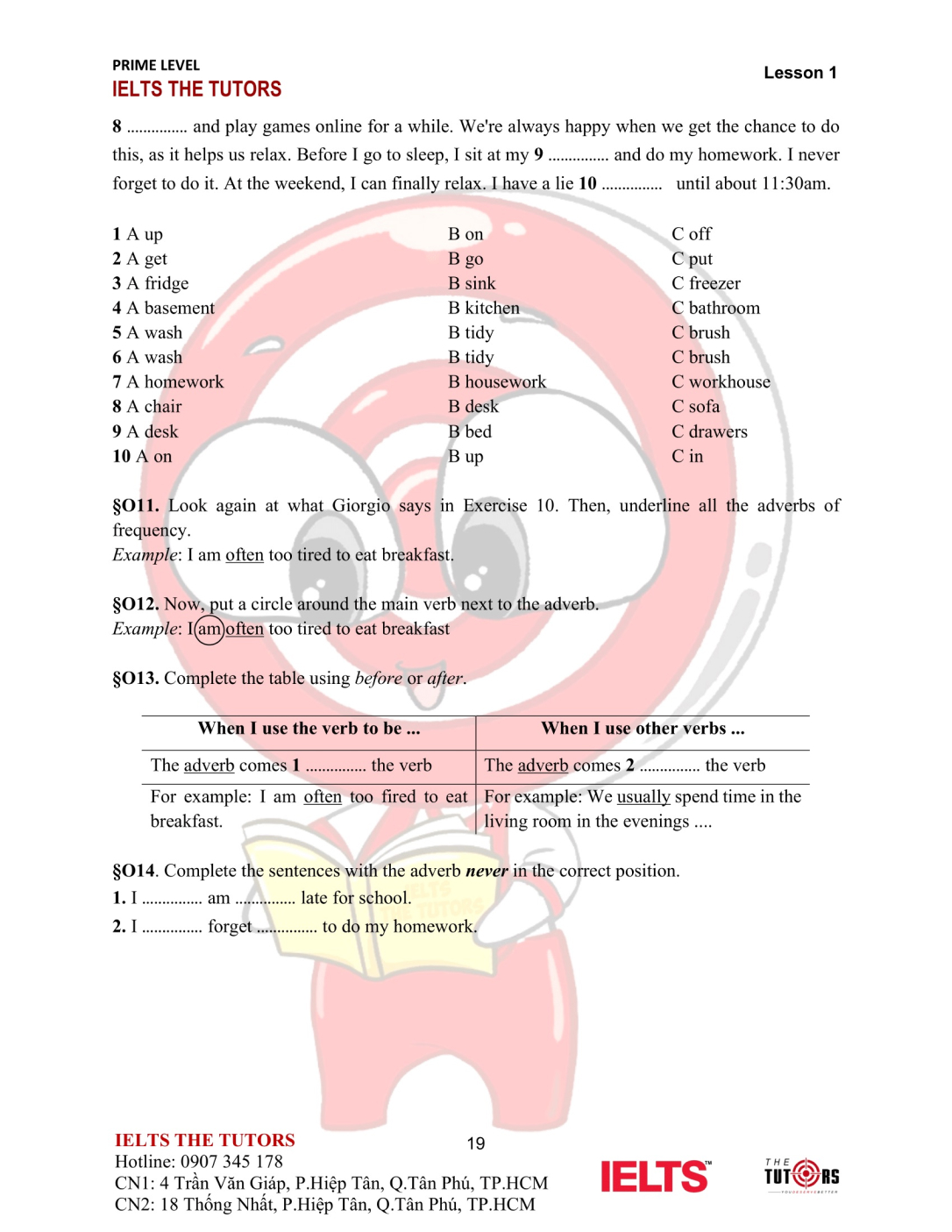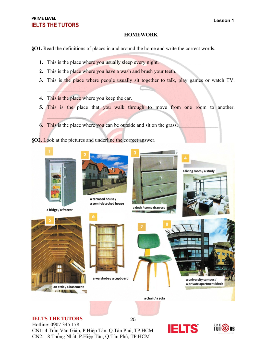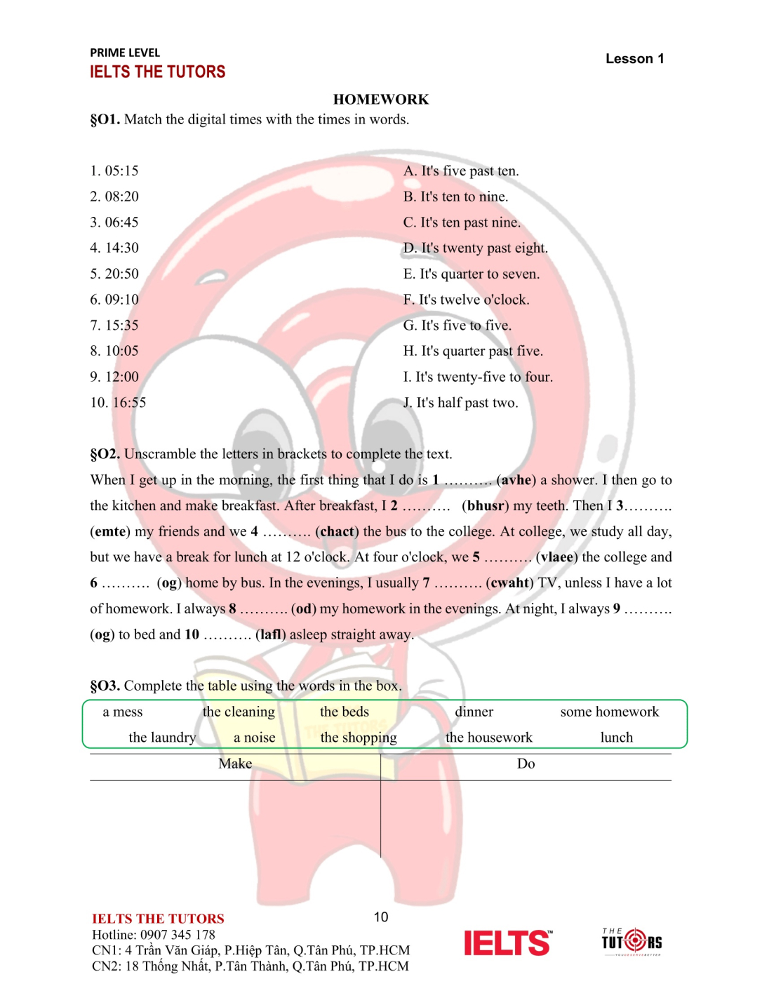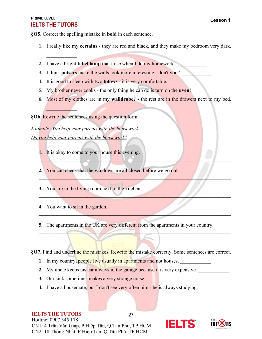 Vocab/Grammar: Học và thực hành sử dụng nhuần nhuyễn từ vựng A1-A2 của 8 chủ đề phổ biến nhất trong IELTS (Family, Friends, Sports, Holidays, Health, Hobbies, Transports…). Áp dụng được các cấu trúc cơ bản, thì hiện tại và quá khứ, động từ khiếm khuyết vào câu nói