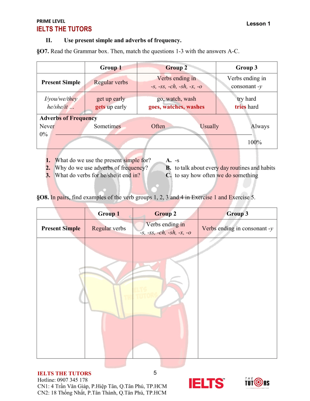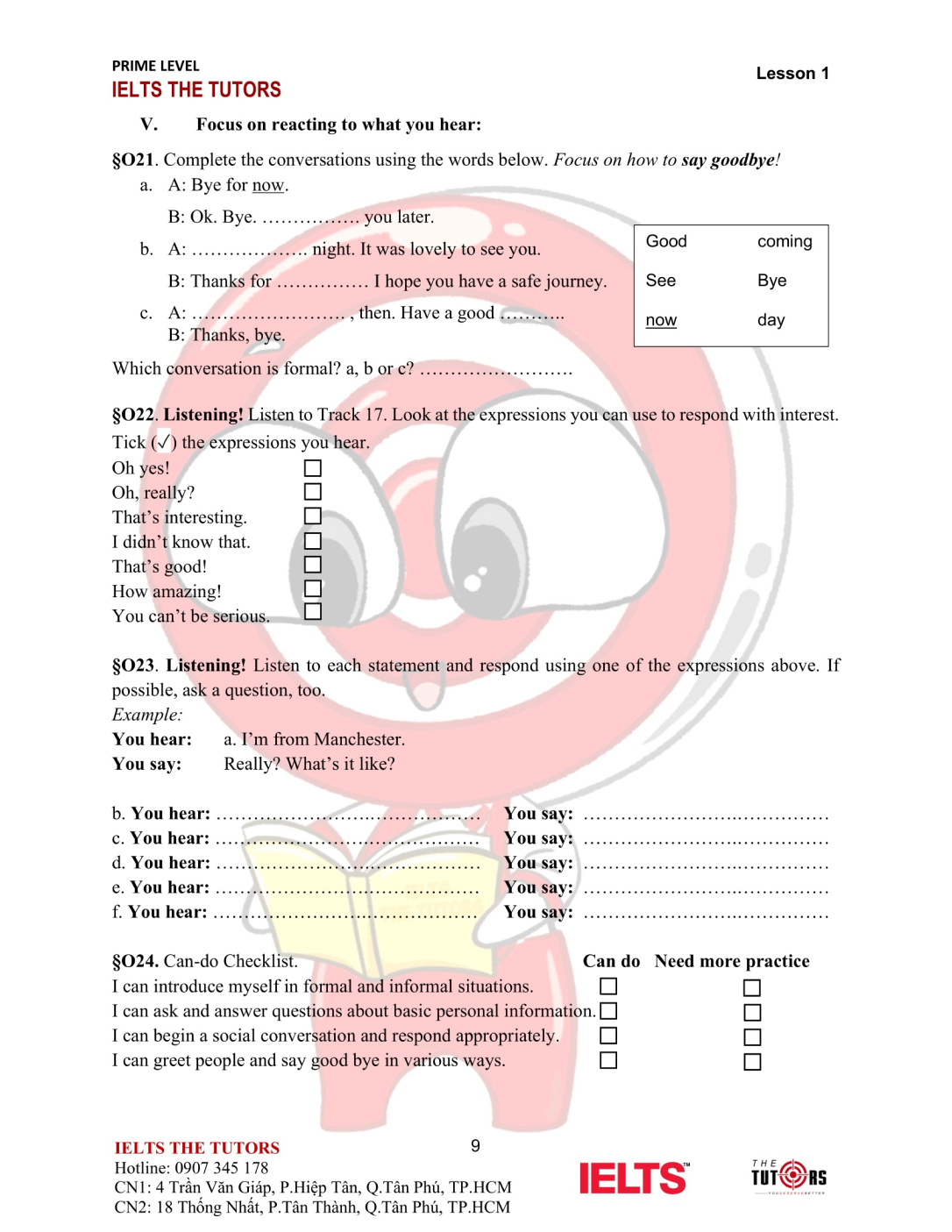 Speaking/Pronunciation: Thực hành phản xạ và nói tự tin với các chủ điểm giao tiếp thường gặp nhất hằng ngày và trong môi trường học thuật. Ngoài ra, học viên biết cách phát âm nguyên âm, phụ âm, trọng âm, âm đuôi và nối âm.