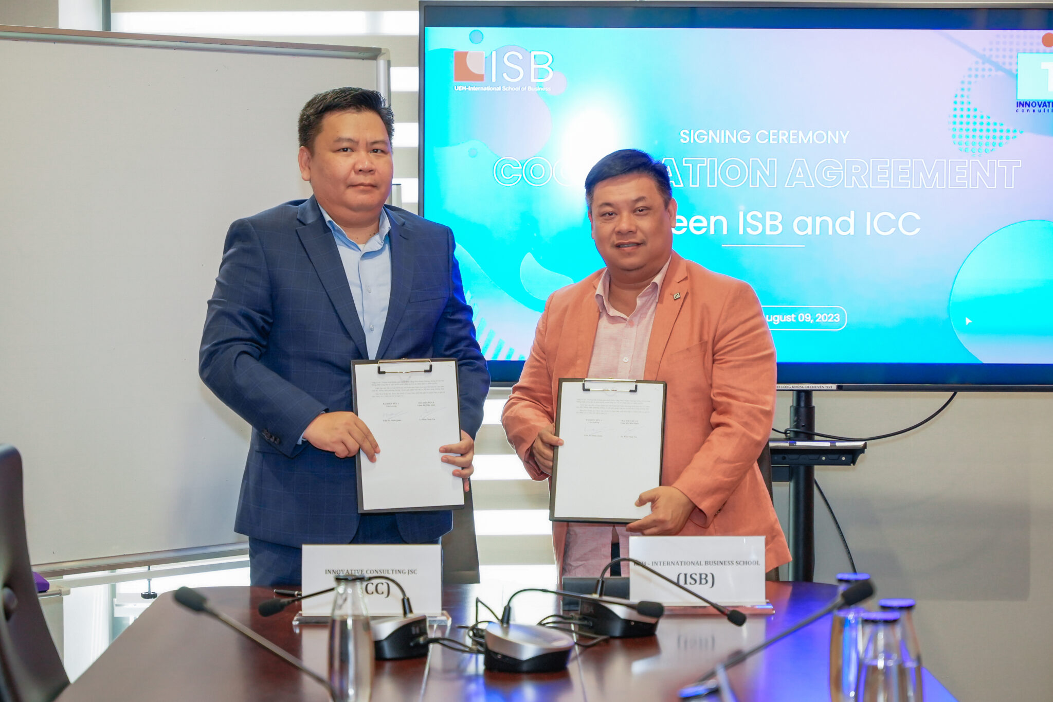 Ngày 09/08/2023, Lễ ký kết thỏa thuận hợp tác (MoU) giữa Viện ISB và Công ty CP Dịch vụ tư vấn giải pháp đổi mới ICC VN (INNOVATIVE CONSULTING JSC) đã được diễn ra tại cơ sở B, Trường Đại học Kinh tế TP. Hồ Chí Minh.
