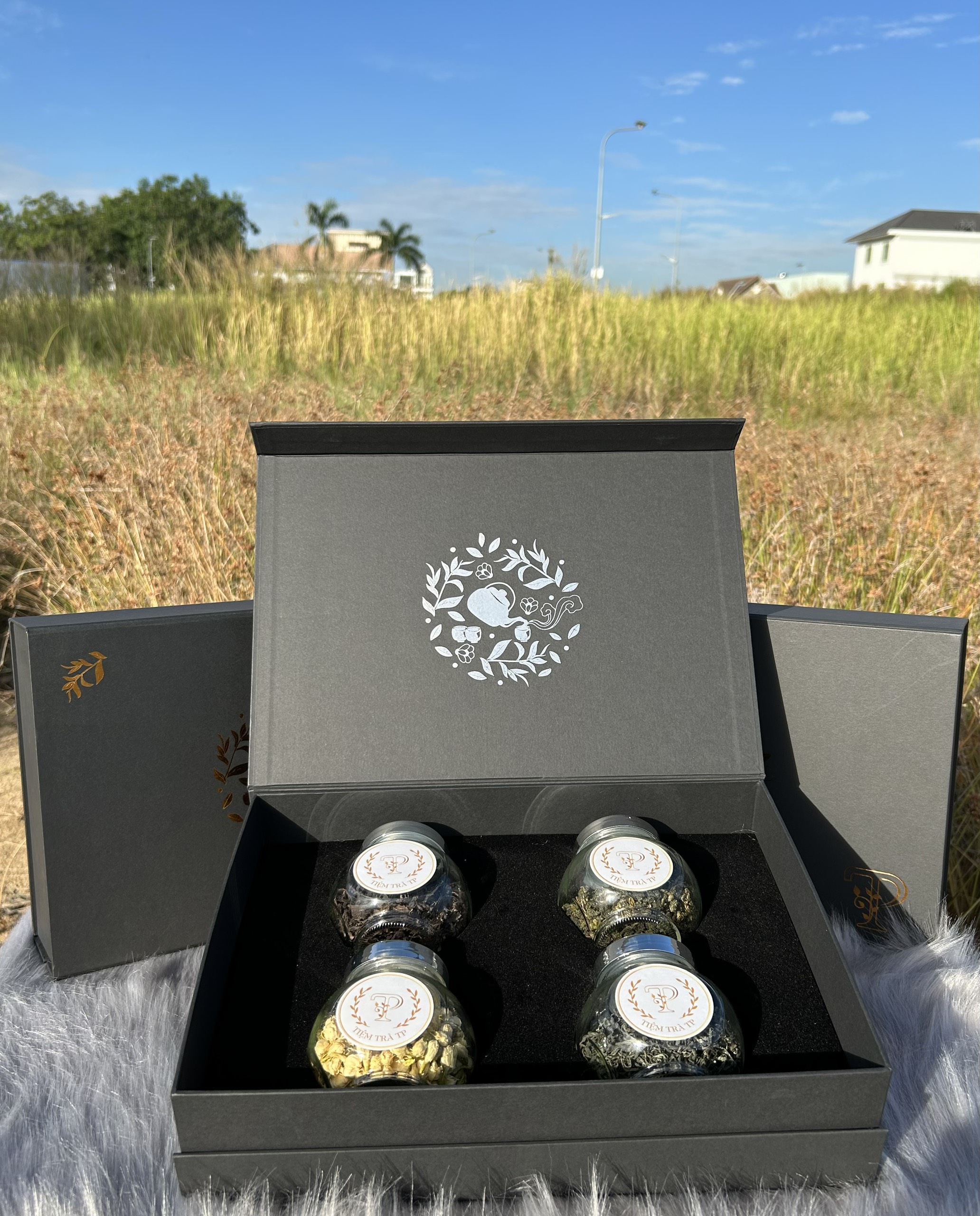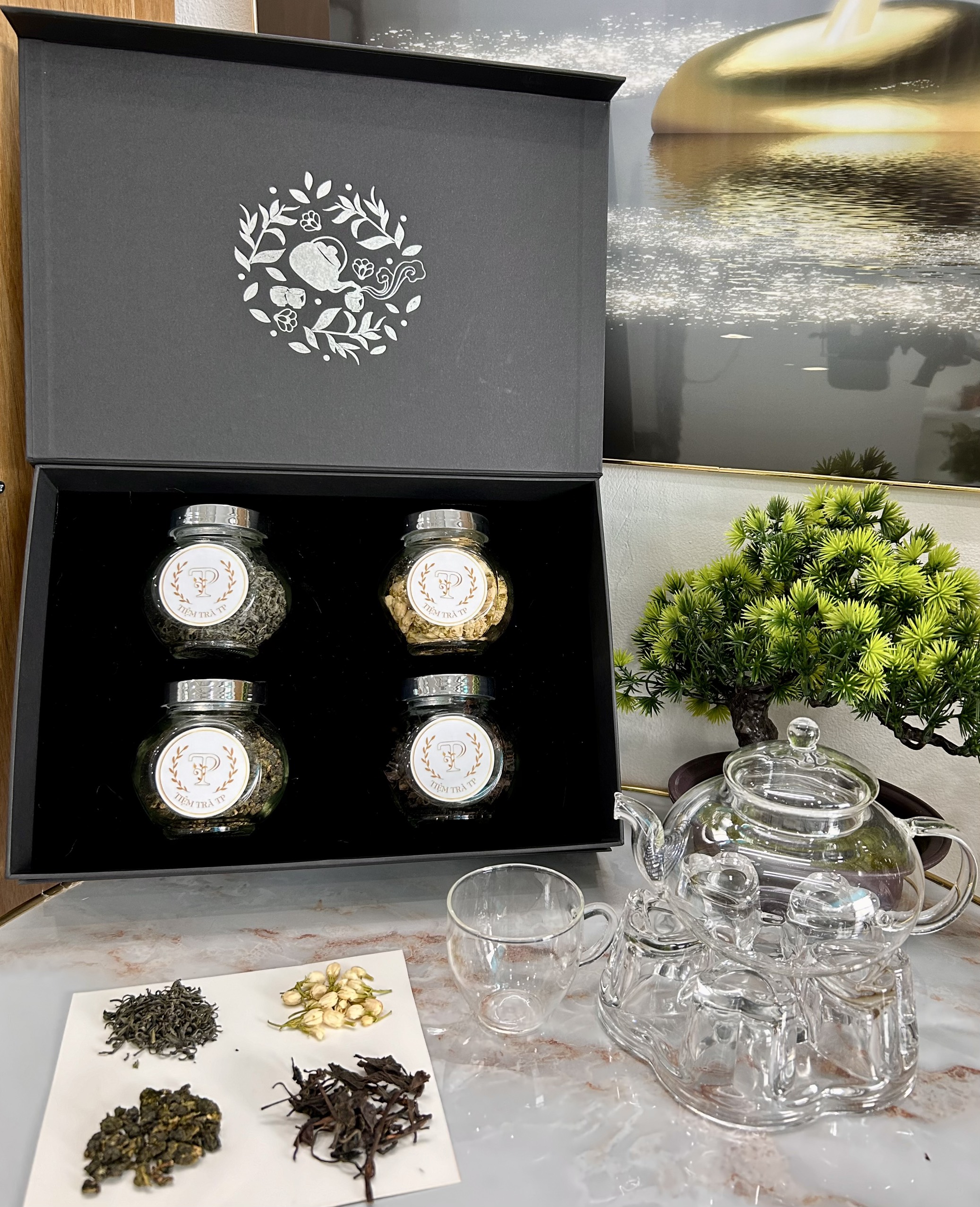 • 3 loại trà lá ngon nhất tại Tiệm trà TP (Trà Móc Câu Thái Nguyên, Trà Ô Long Tứ Quý, Trà Đen Shan Tuyết Cổ Thụ) kết hợp cùng với Trà Hoa Nhài, đựng trong hũ thủy tinh 180ml.