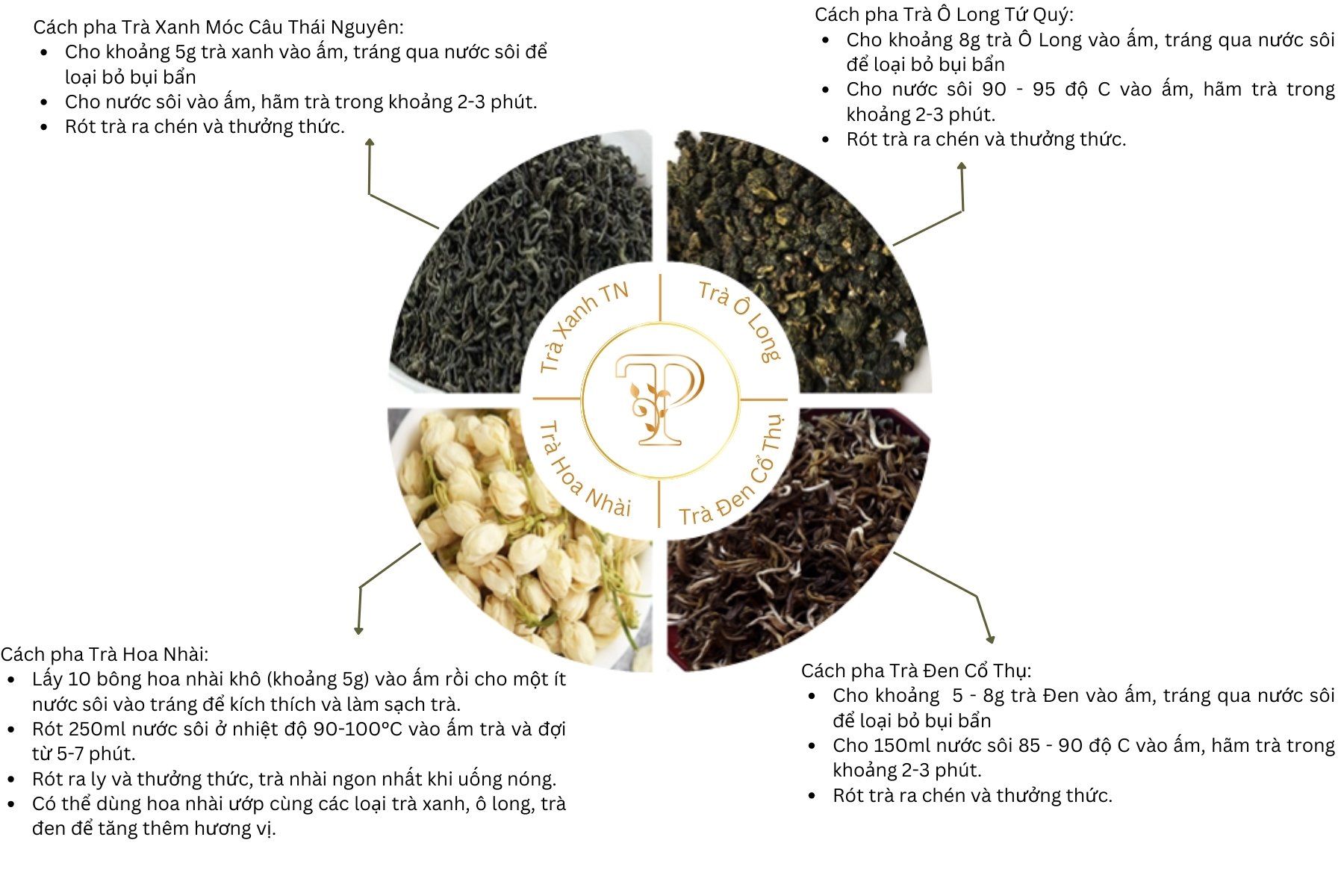 Thành phần: Trà Móc Câu Thái Nguyên, Trà Ô Long Tứ Quý, Trà Đen Shan Tuyết Cổ Thụ, Trà Hoa Nhài