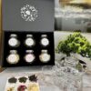 - Hộp quà đen nắp nam châm sang trọng được làm từ chất liệu giấy ép mĩ thuật cao cấp, có họa tiết tinh tế in chìm màu vàng ánh kim với khay nhung đen mềm mịn đựng 4 sản phẩm trà bên trong, kích thước 30x20x7cm.