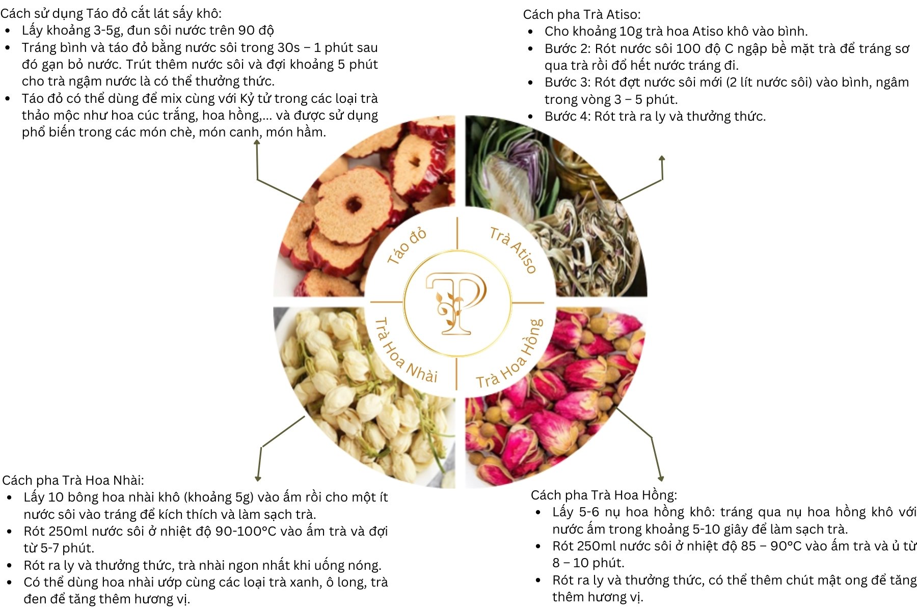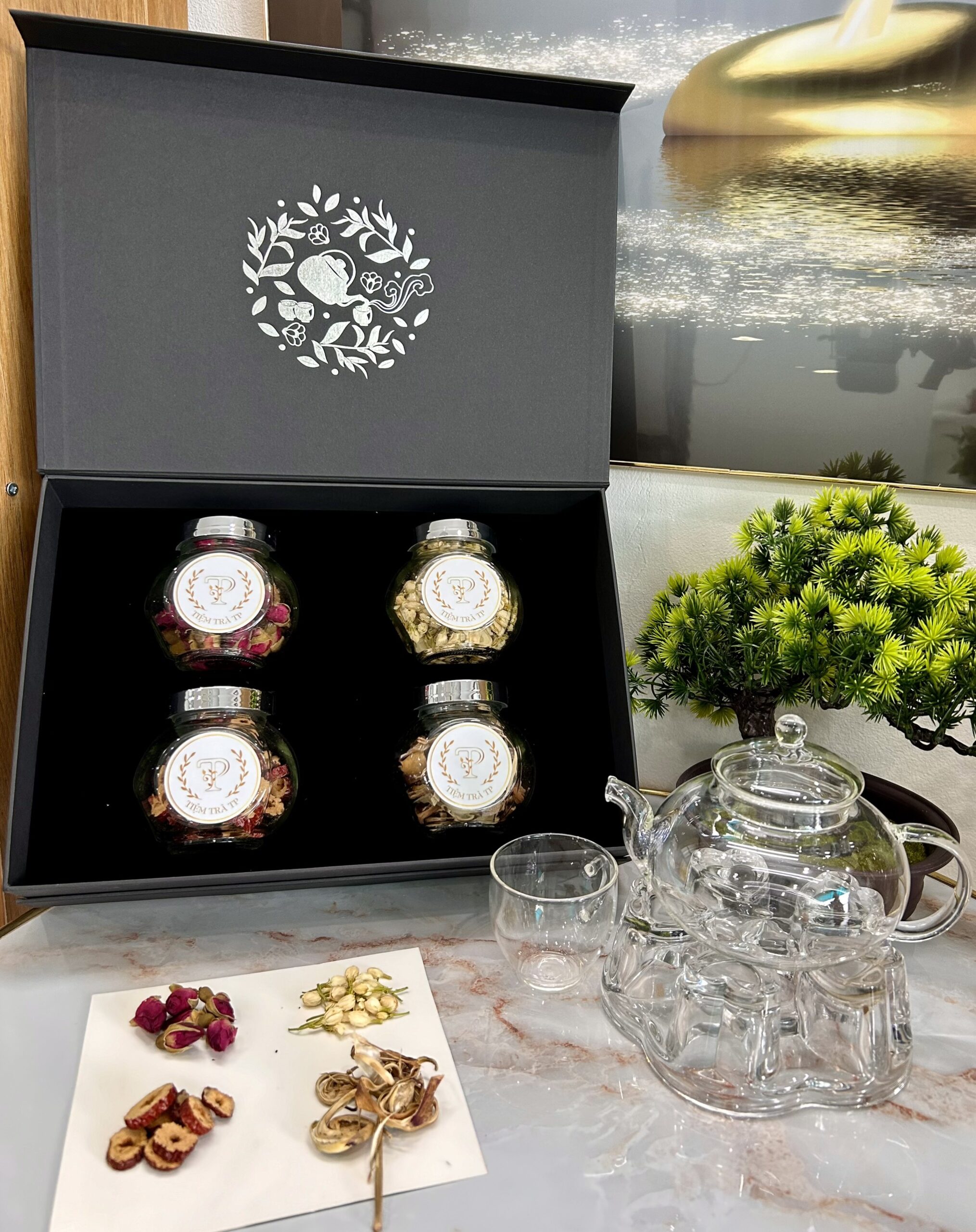 - 4 loại thảo mộc tại Tiệm trà TP (Trà Hoa Hồng, Trà Hoa Nhài, Trà Hoa Atiso và Táo Đỏ), đựng trong hũ thủy tinh 180ml.
