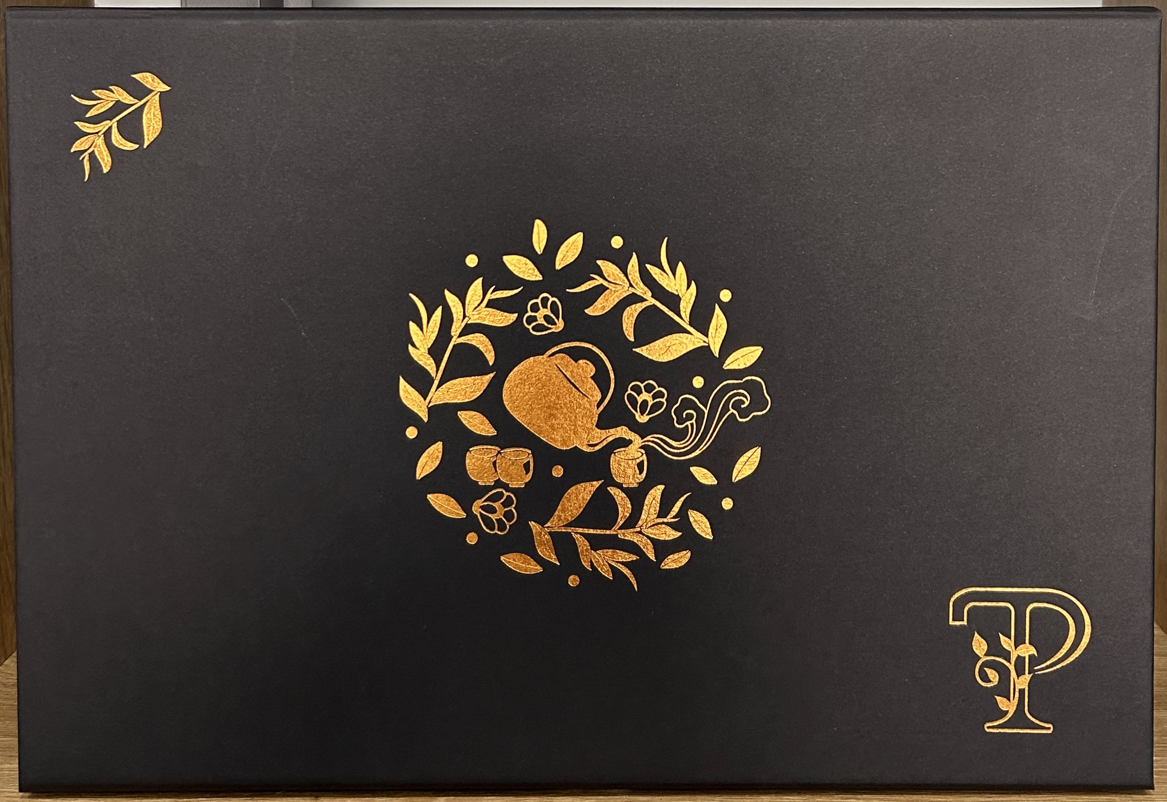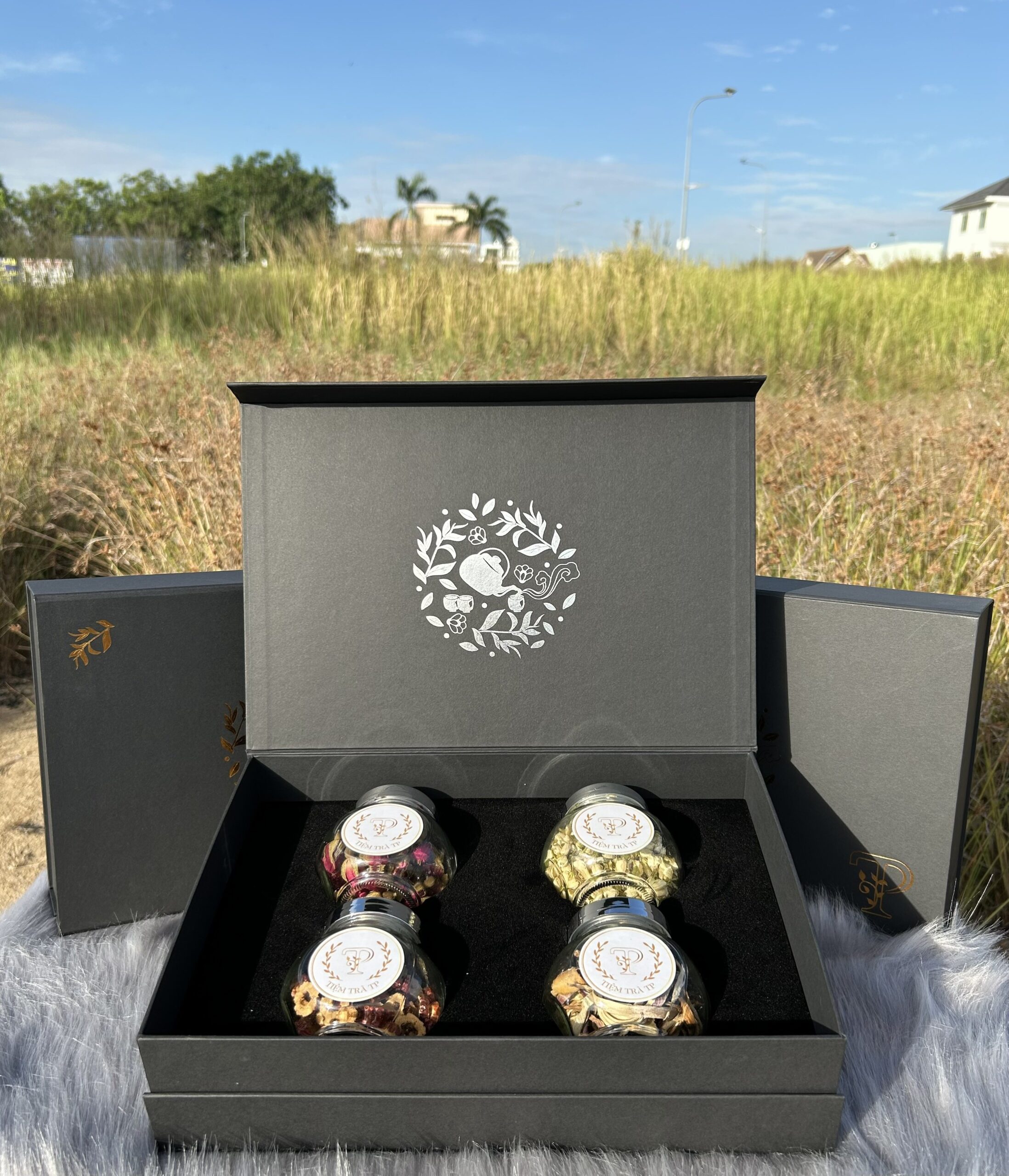 - Hộp quà đen nắp nam châm sang trọng được làm từ chất liệu giấy ép mĩ thuật cao cấp, có họa tiết tinh tế in chìm màu vàng ánh kim với khay nhung đen mềm mịn đựng 4 sản phẩm trà bên trong, kích thước 30x20x7cm.