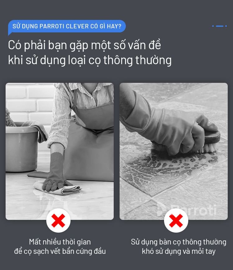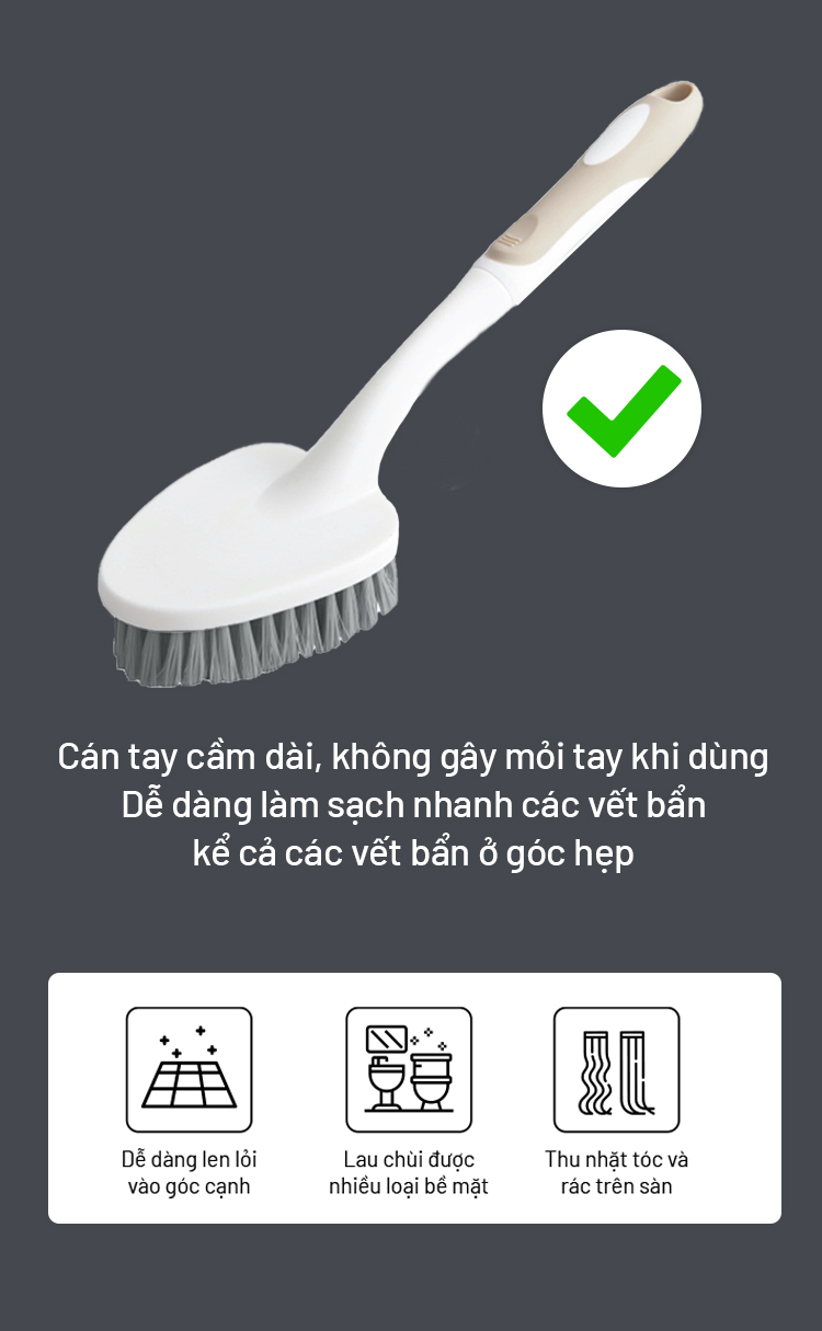 – Mặt bàn chải rộng giúp chà cọ sạch mọi vết bám bẩn, ố vàng trên mặt sàn
