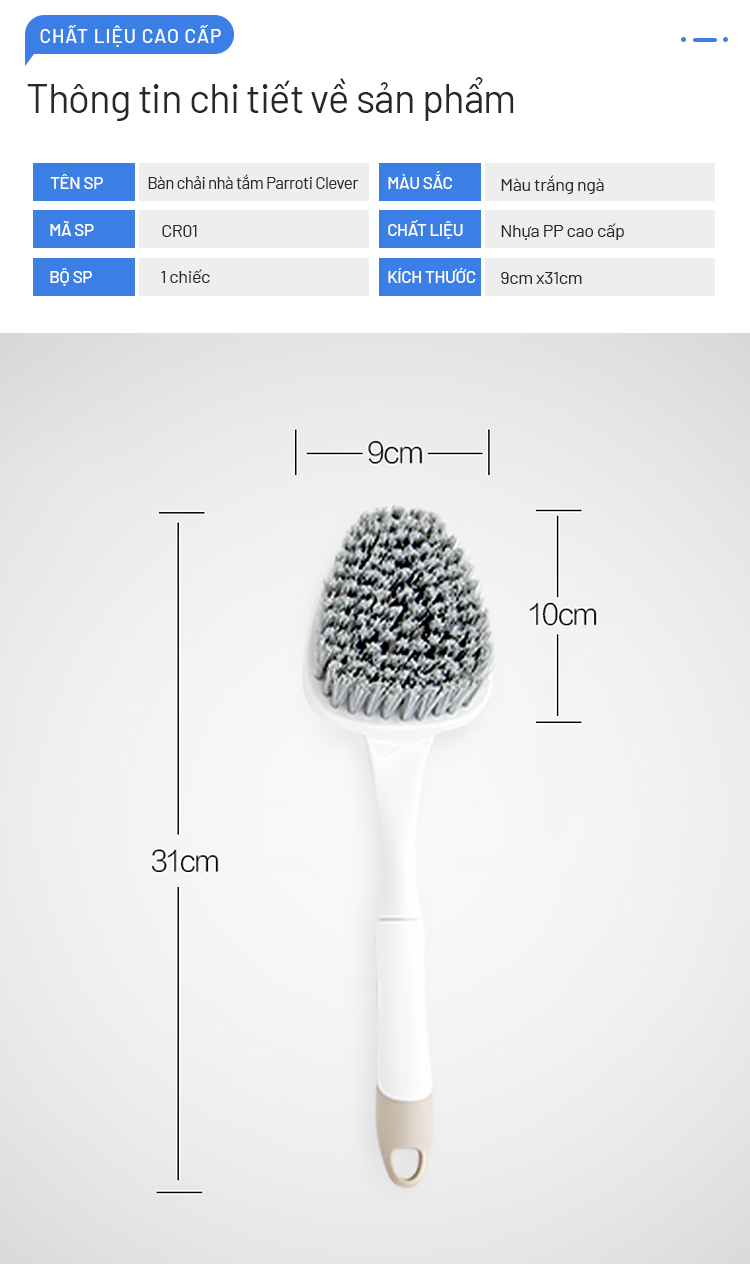 – Kích thước sản phẩm Bàn chải nhà tắm Parroti Clever – CR01: 31cm x 10cm x 9cm