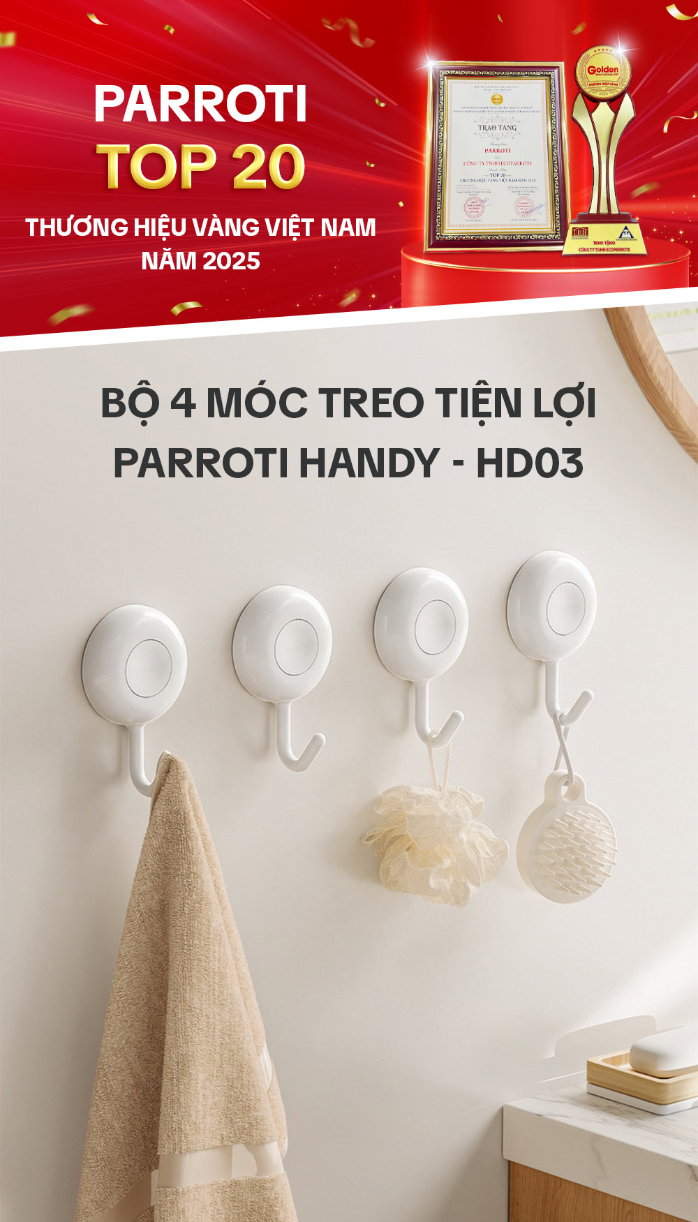 Bộ 4 chiếc móc treo dán tường đa năng Parroti Handy HD03