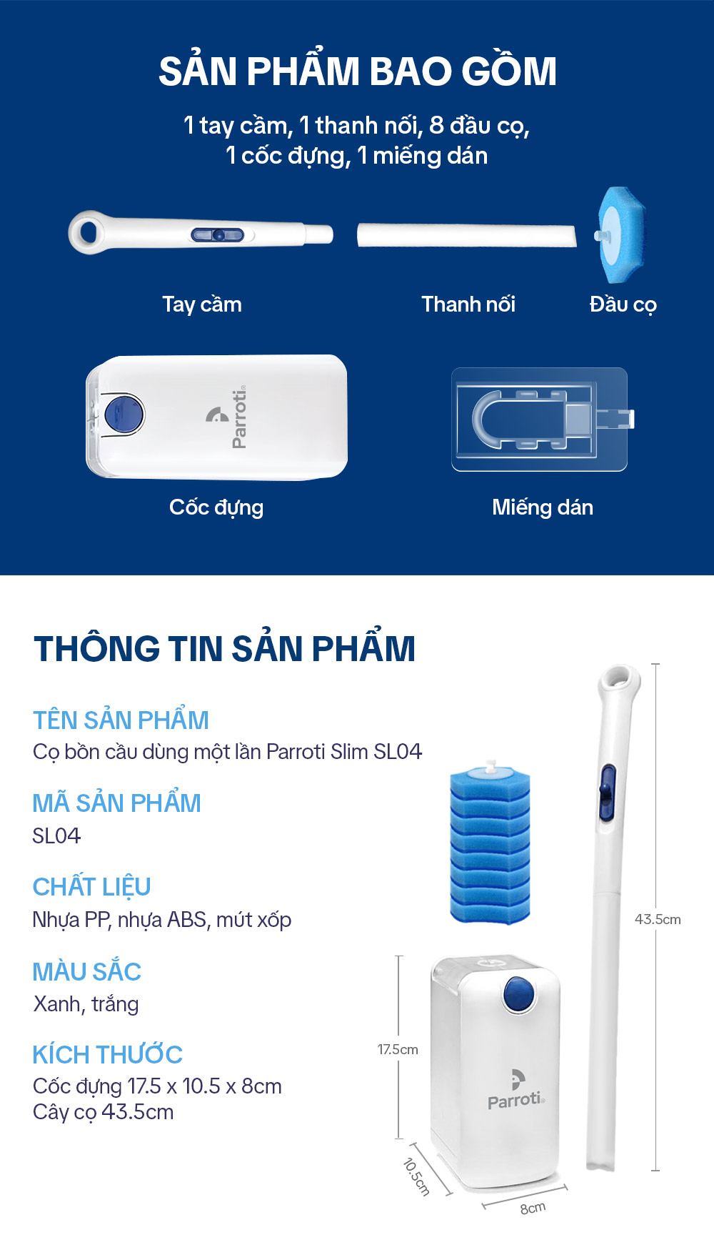 – Tên sản phẩm: Cây Cọ Bồn Cầu Dùng Một Lần 2 Trong 1, Miếng Lau Có Chất Tẩy Rửa Hương Thơm, Dán Tường Parroti Slim – SL04