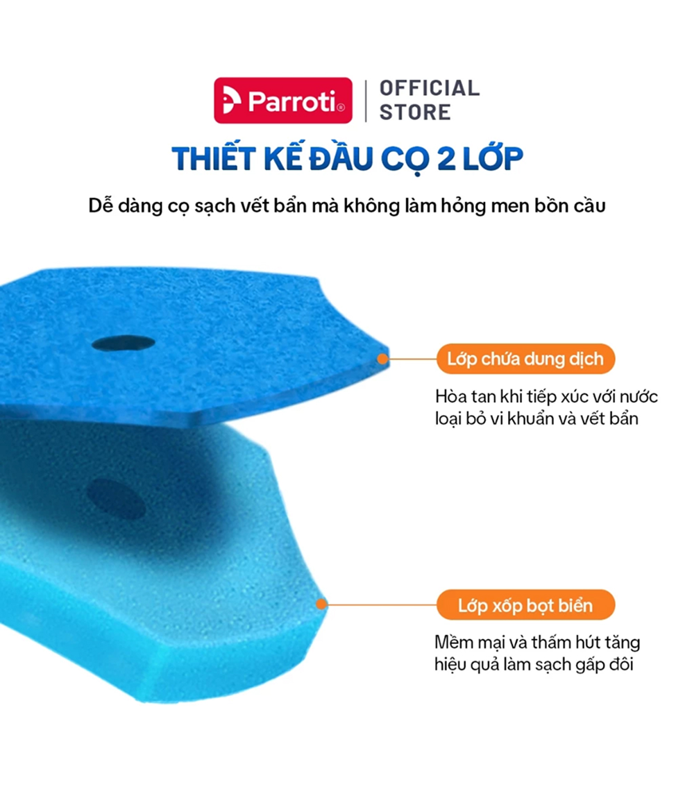 – Thiết kế đầu cọ 2 lớp dễ dàng cọ sạch mà không hỏng men bồn cầu.