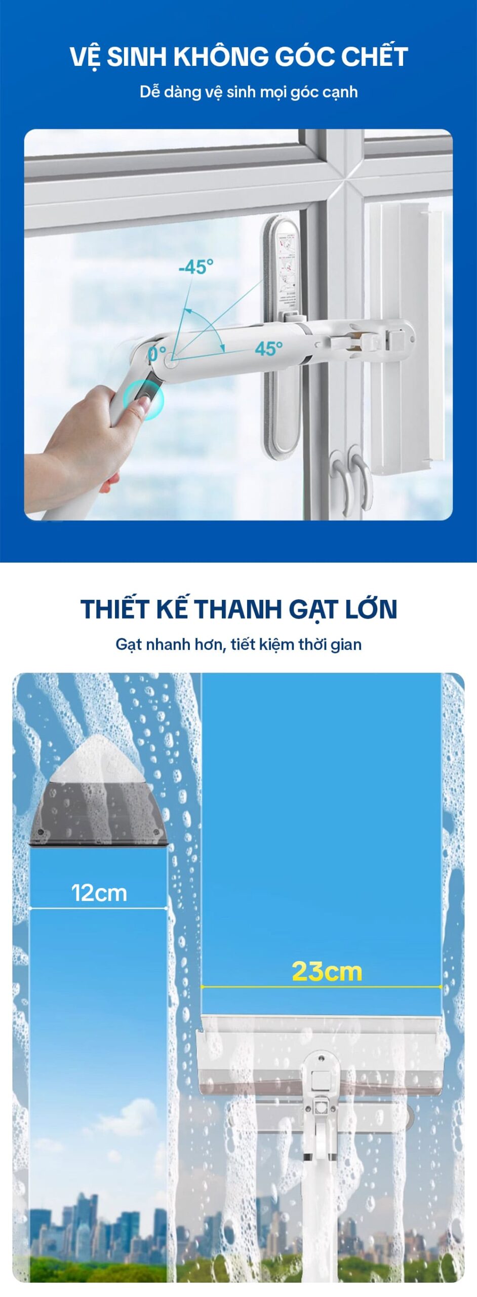 – Bàn chà rộng (23 cm), giúp bạn chùi kính nhanh hơn loại thông thường