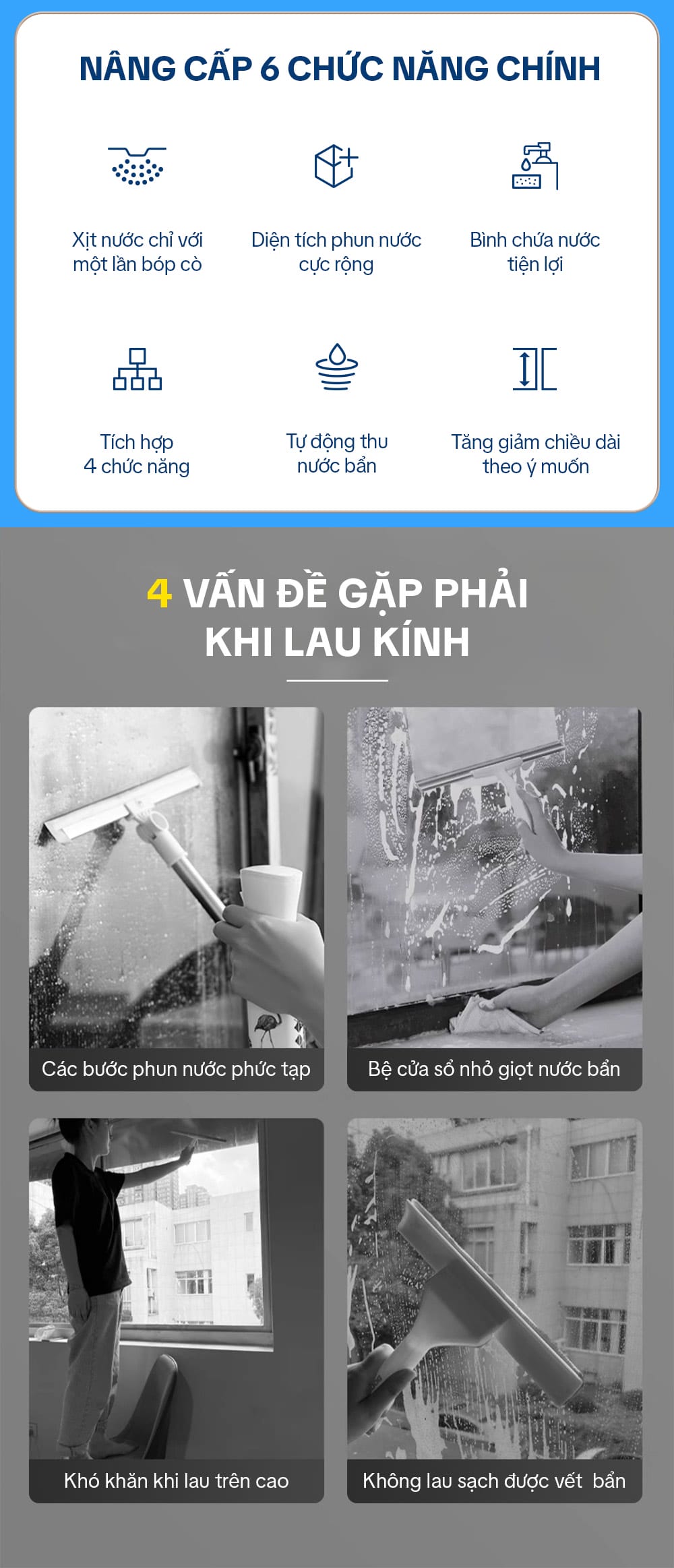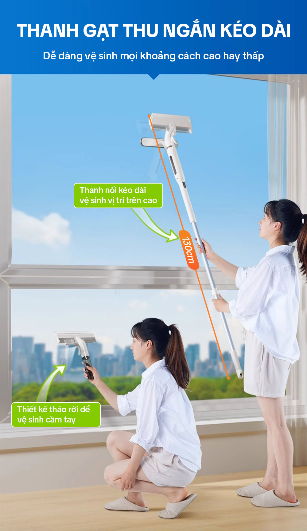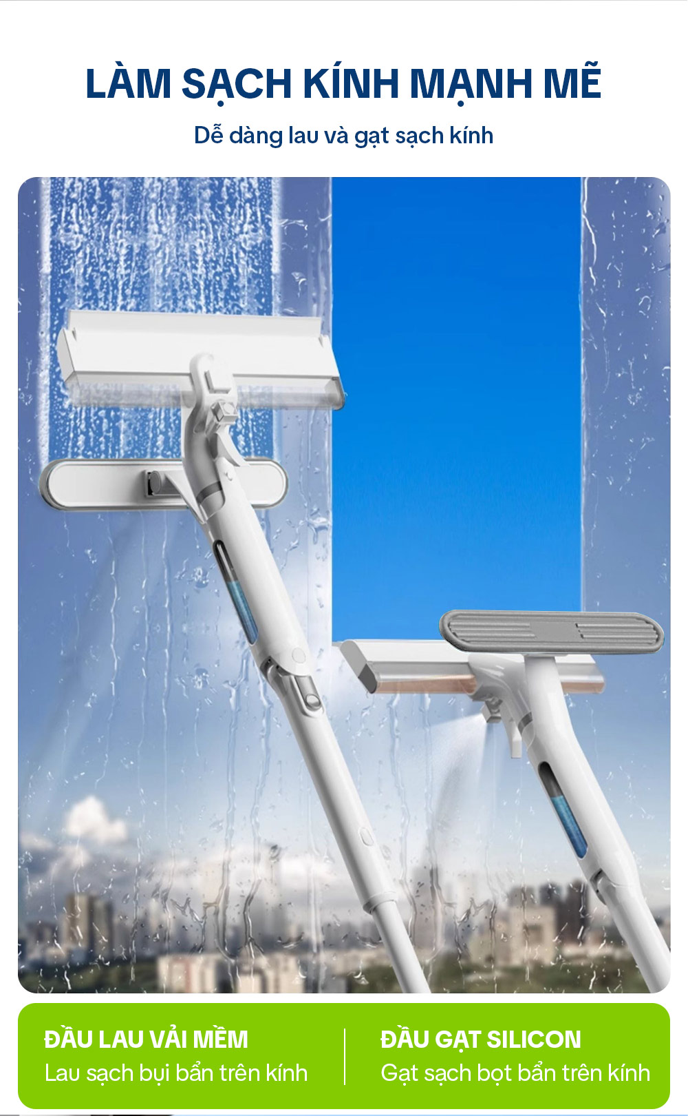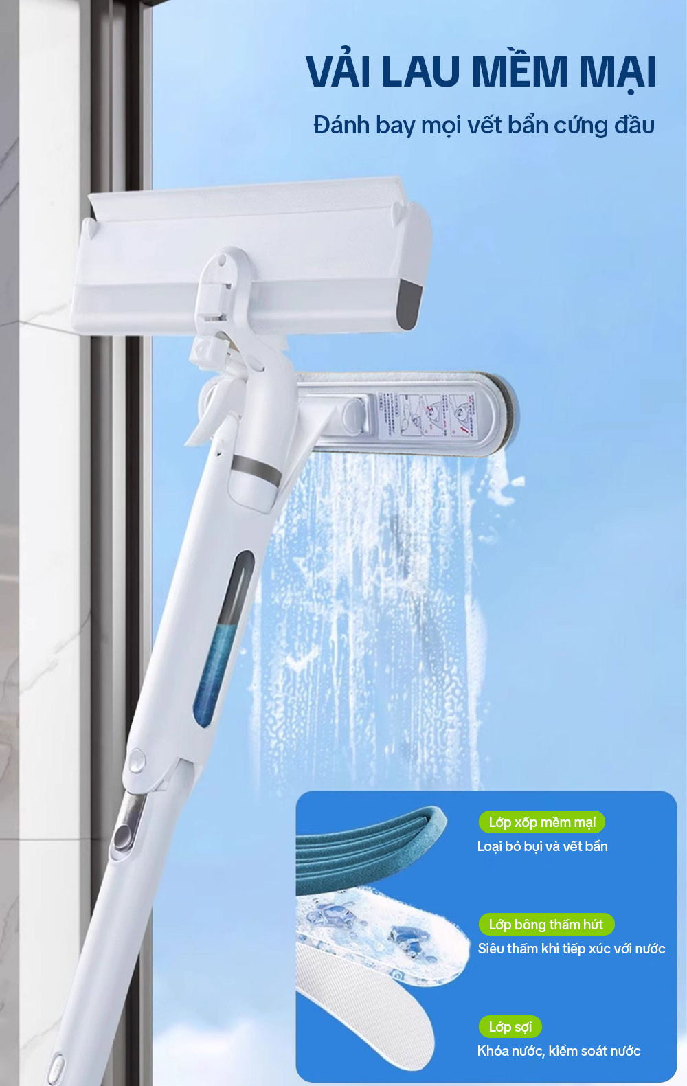 – Thân cây lau kính được làm bằng nhôm cao cấp, có chốt thay đổi độ dài linh hoạt