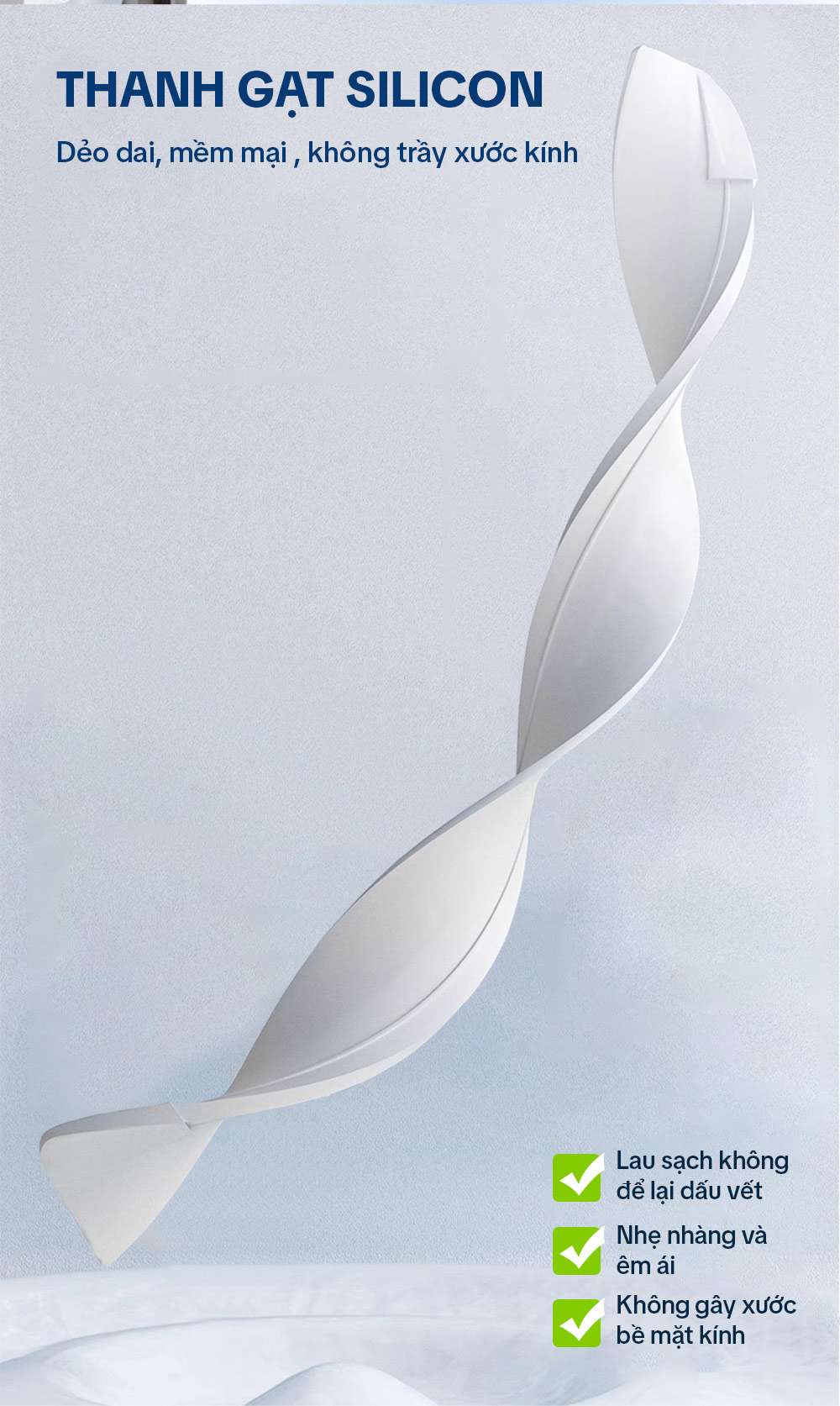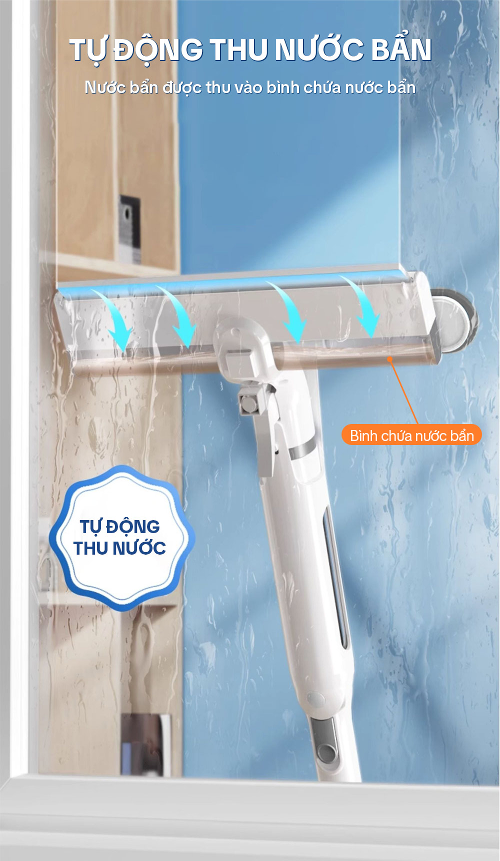 – Bước 4: Quay đầu thanh gạt cao su để gạt nước hoặc chất bẩn trên mặt kính, nước bẩn sẽ được gom vào bình đựng ở thân cây lau
