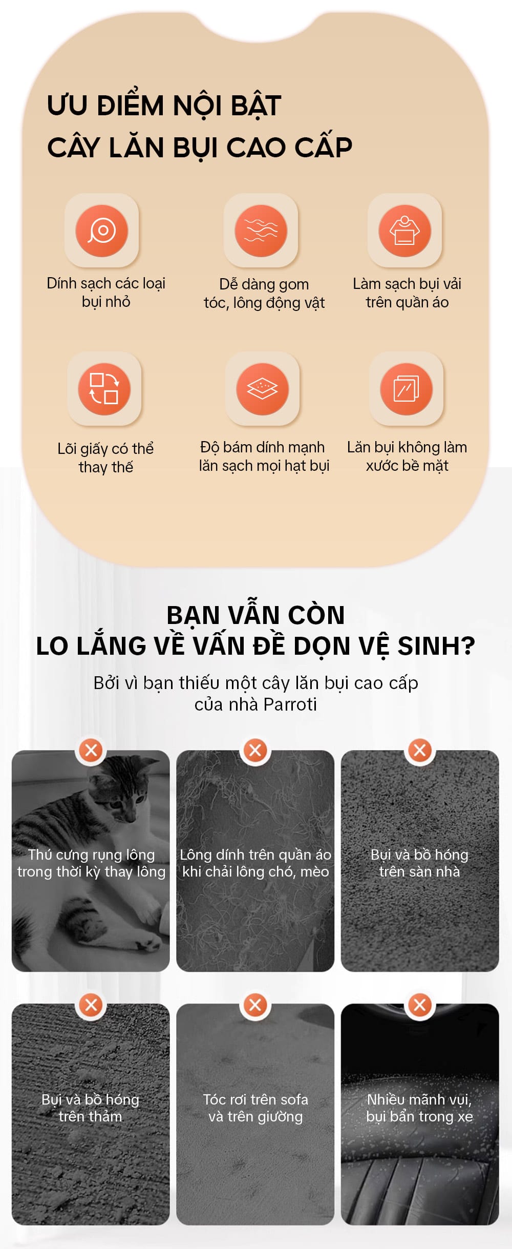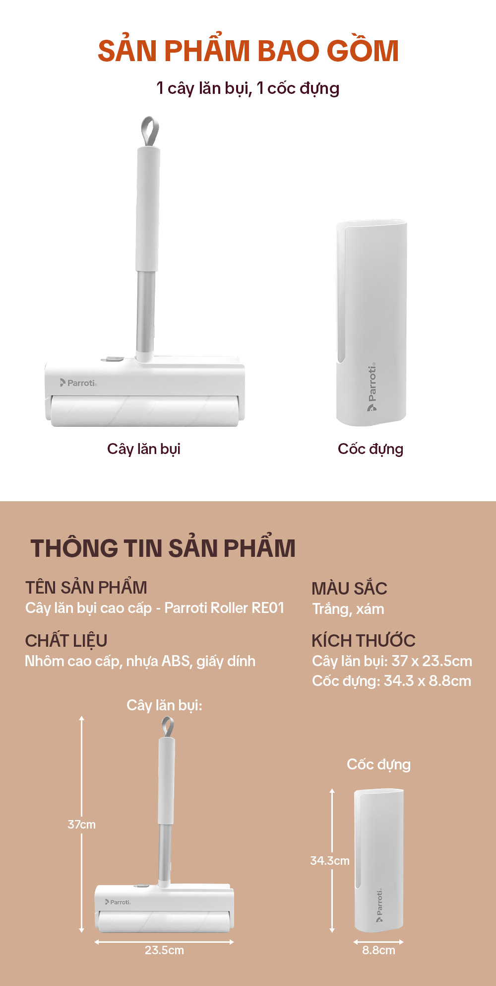 – Bộ sản phẩm gồm: 1 cây lăn bụi, 1 lõi lăn và 1 ống đựng bảo quản lõi lăn