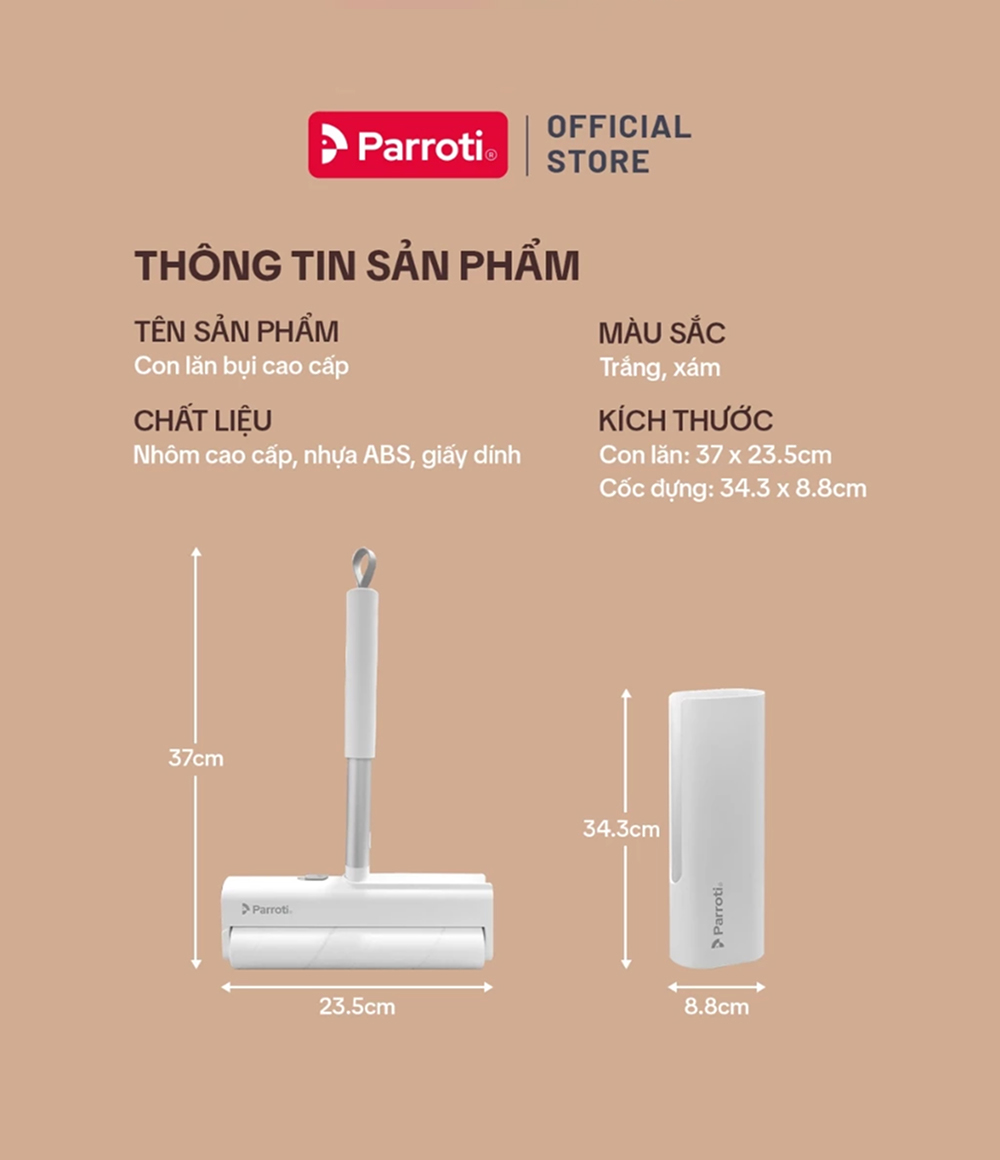 – Tên sản phẩm: Cây lăn bụi cán nhôm cao cấp Parroti Roller – RE01
