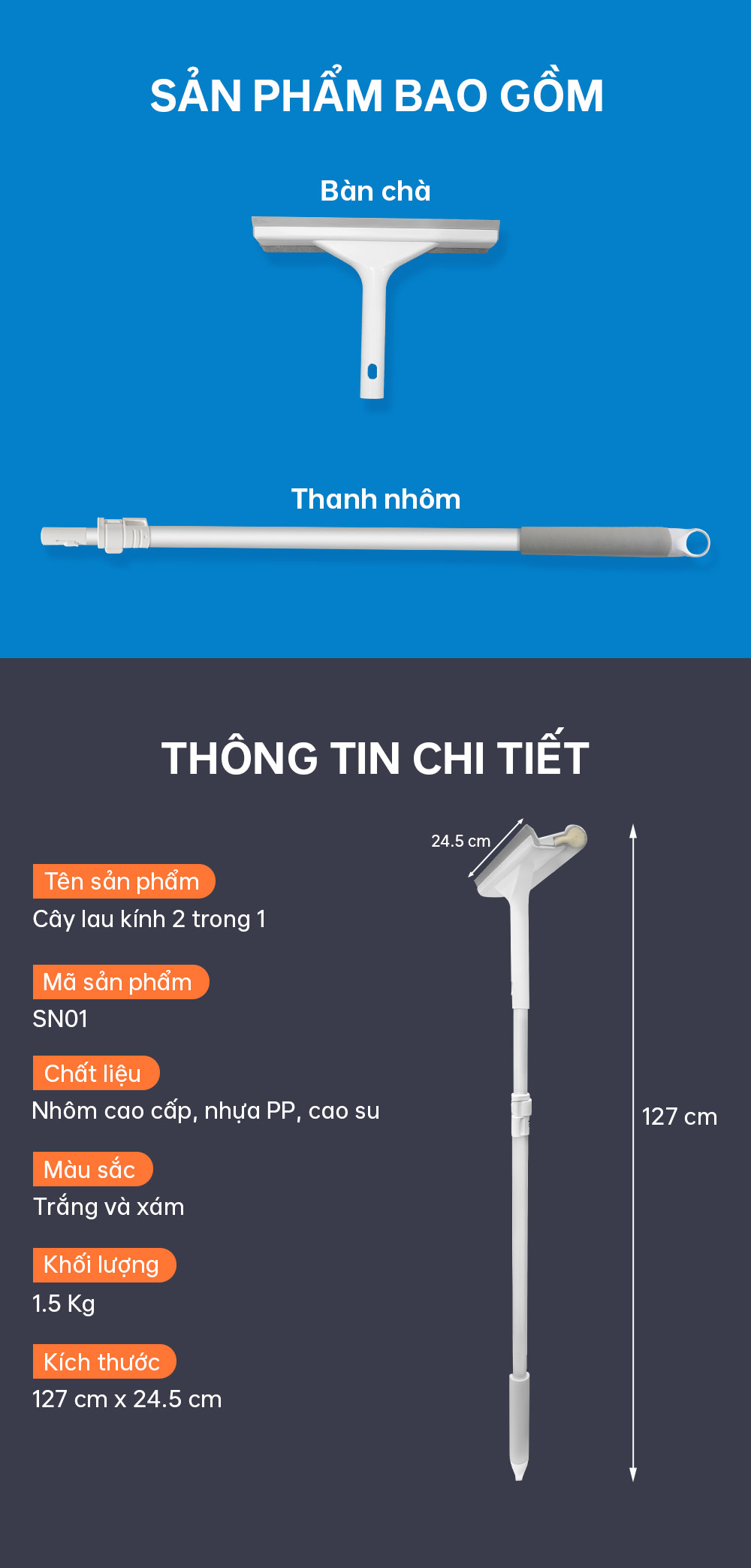 – Thân cây lau kính được làm bằng nhôm cao cấp, có chốt thay đổi độ dài linh hoạt