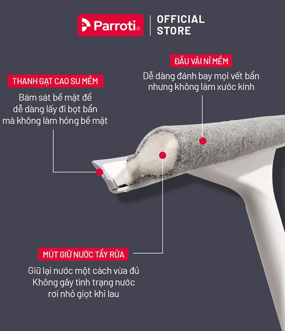 – Thiết kế thông minh 2 trong 1: Có thể vừa chà cọ mặt kính vừa có thể gạt nước và chất bẩn, giúp gương kính nhà bạn luôn khô sạch