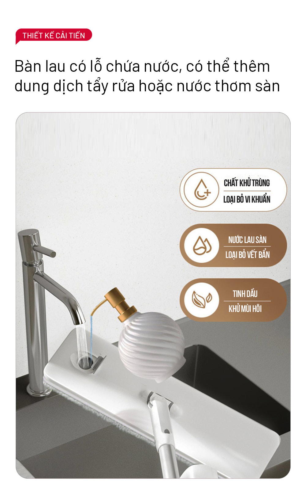 – Bước 2: Cho nước sạch và nước lau sàn vào van nước ở trên bàn lau.