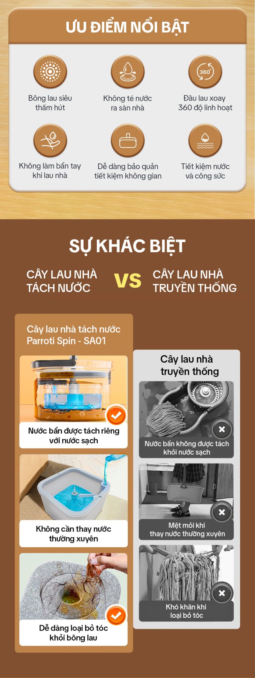 Cây lau nhà tách nước bẩn thông minh, xoay 360 độ Parroti Spin SA01