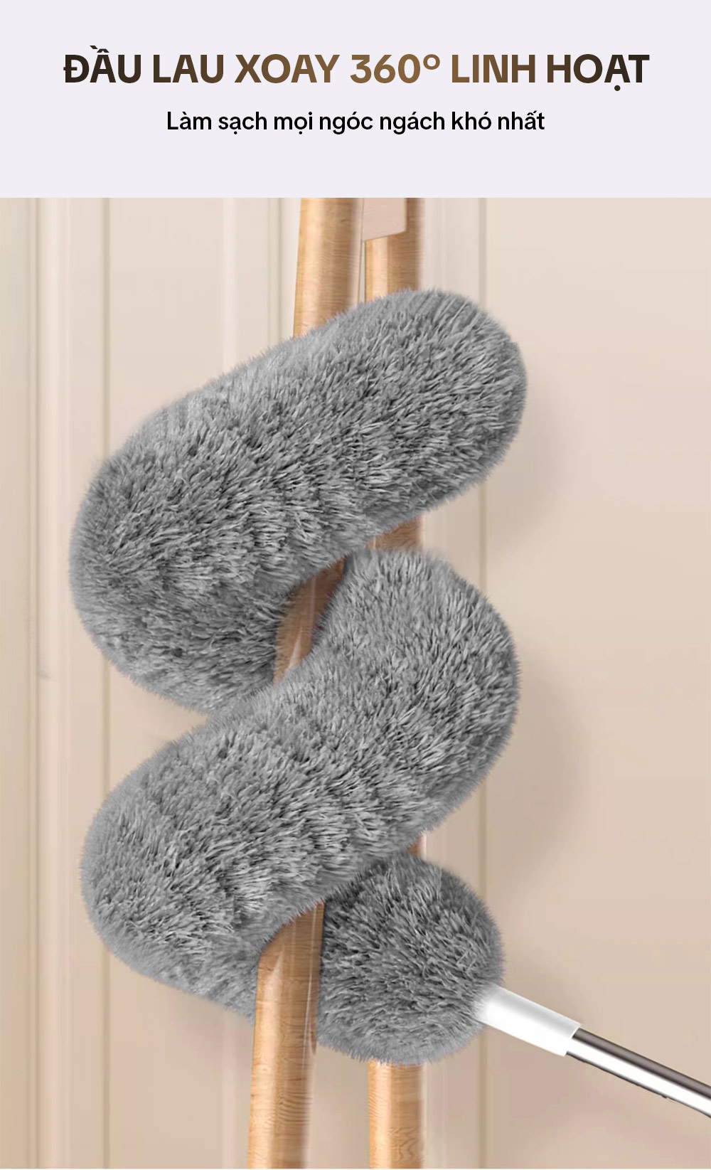 – Đầu lau có xương bằng thép dẻo, giúp dễ dàng uốn cong, vặn xoắn phù hợp cho mọi vị trí ngóc ngách.