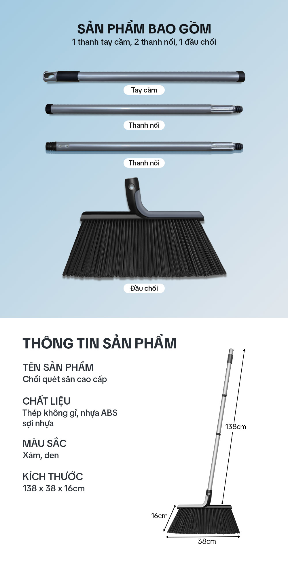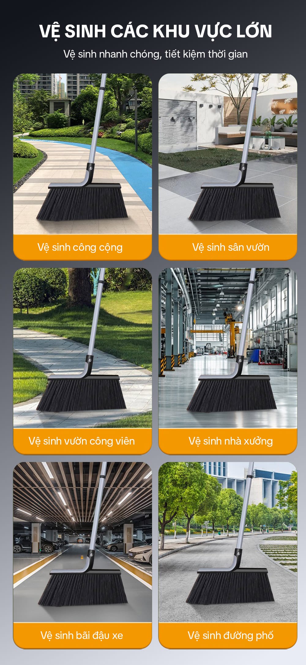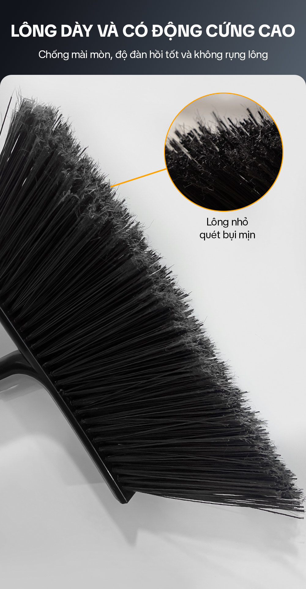 – Lông chổi dày phần tiếp xúc với mặt sàn được làm nhỏ giúp dễ dàng làm sạch cả bụi mịn