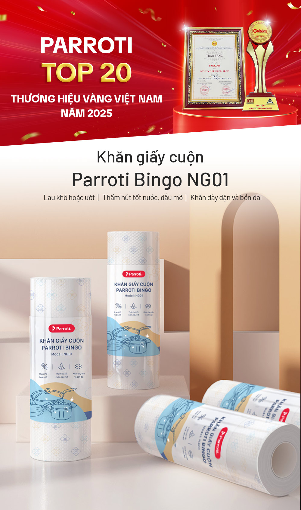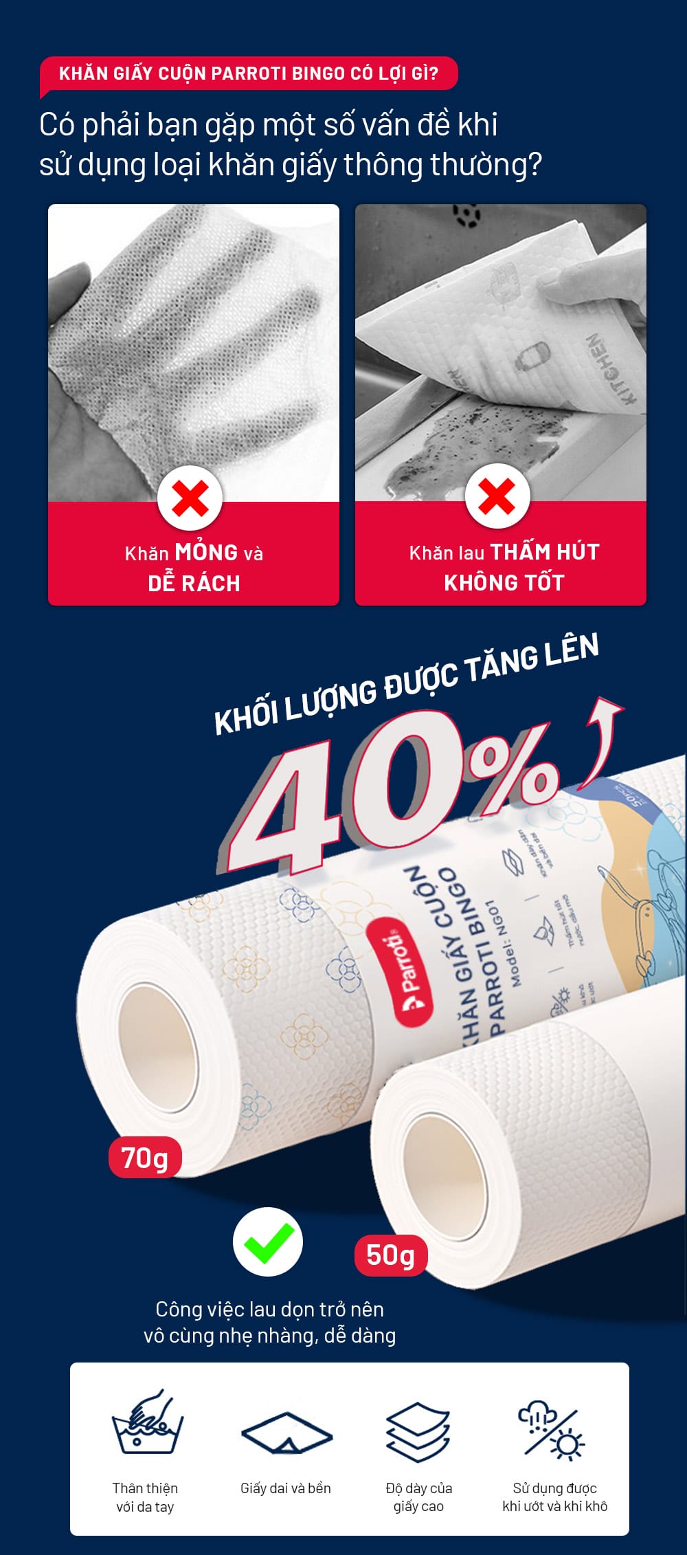 – Tên sản phẩm: Khăn giấy cuộn đa năng, lau bếp, lau kính, lau chén bát, lau tay – Parroti Bingo NG01